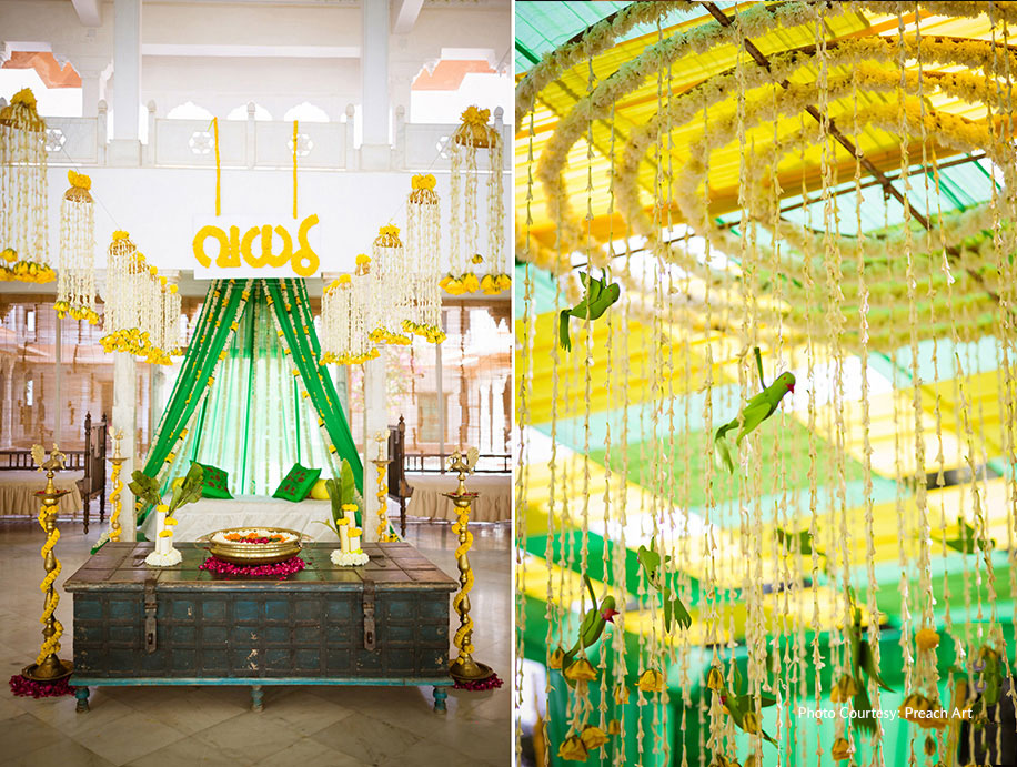 “We gave the mehndi function a fun twist by creating a mini Kerala at the venue. Each guest dressed up in traditional attire of Kerala, and we also got the Udaipur Kerala Samajan to perform traditional dances. The decor was beautifully done with Malayalam signboards, banana trees and flower rangoli (pookalam). Other highlights included Malayali-themed games and coconut water with vodka. Watching our ‘Gujju’ (Gujarati) family in ‘mundus’ (Kerala dhoti) was priceless. I entered the venue with my bridesmaids who danced to ‘Mangalayam’ from the movie ‘Bangalore Days’. My saree for this function was Pranaah, Kerala, and jewellery from Joyalukkas in New Delhi.”