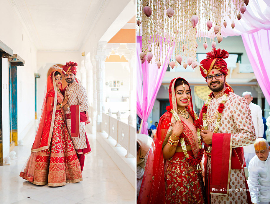 “The wedding ceremony was conducted as per Gujarati traditions, and a few Malayali rituals were incorporated into it too. The decor was designed around pastel pink lotuses and made use of lots of lotus buds. Even the ‘phoolon ki chaadar’ (floral canopy) under which I entered featured the same flowers. I wore a red lehenga by Asiana Couture in New Delhi and teamed it with jewellery from Jewel Ocean. Dhruvil donned a sherwani from Jade Blue in Ahmedabad, Gujarat.”