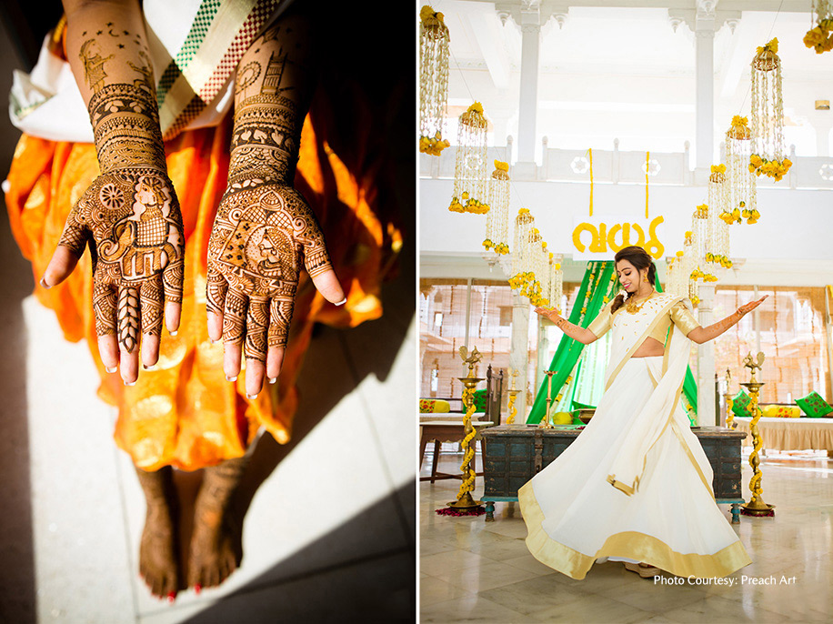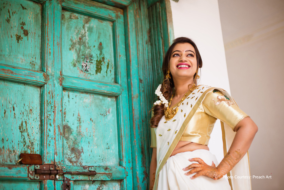 Meghana and Dhruvil went to London for their higher studies and were united by cocktails and clumsiness. However, their two different cultures came together beautiful during their Malayali-Gujarati wedding celebrations. Here, bride Meghana shares with us photographs and memories by WeddingSutra Favorite Preach Art from her big day.