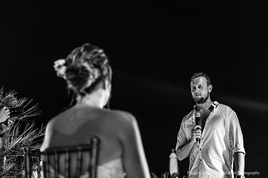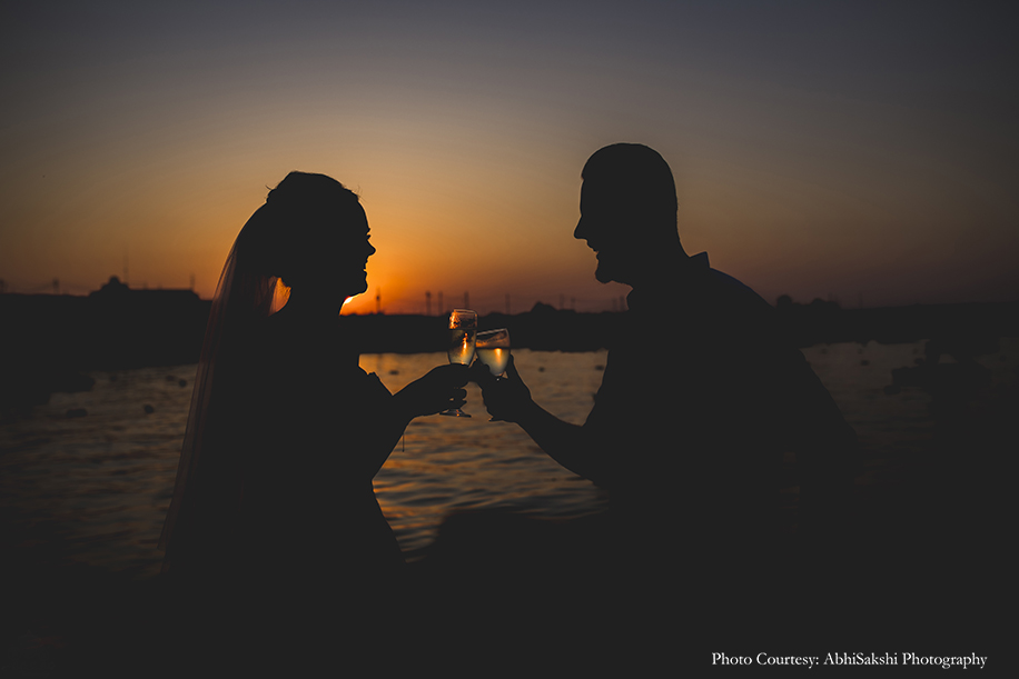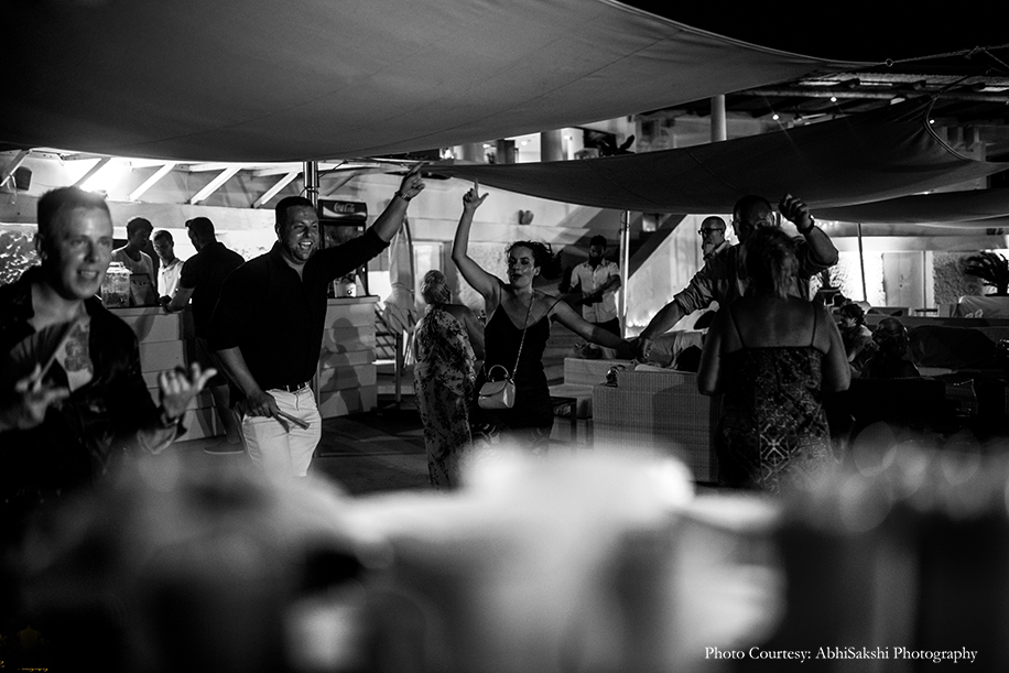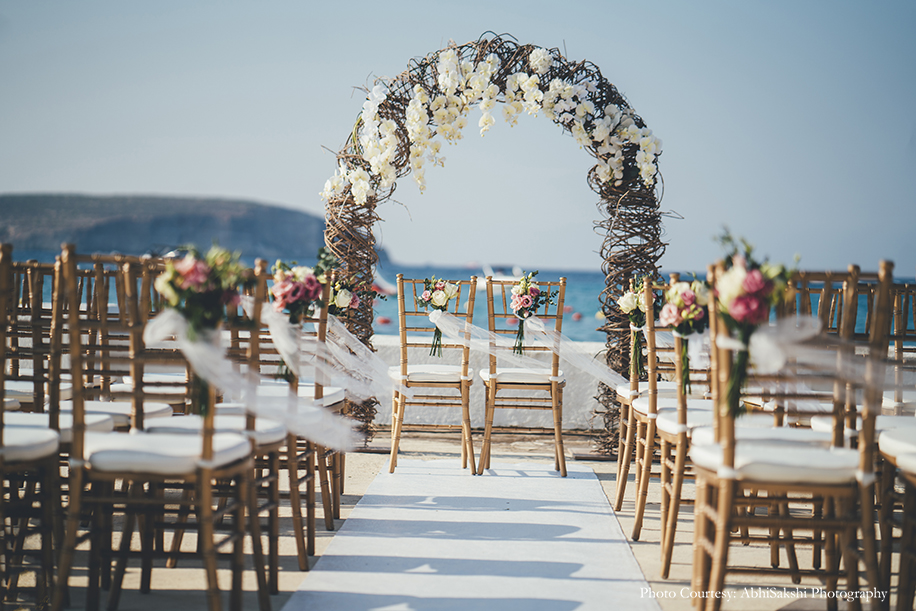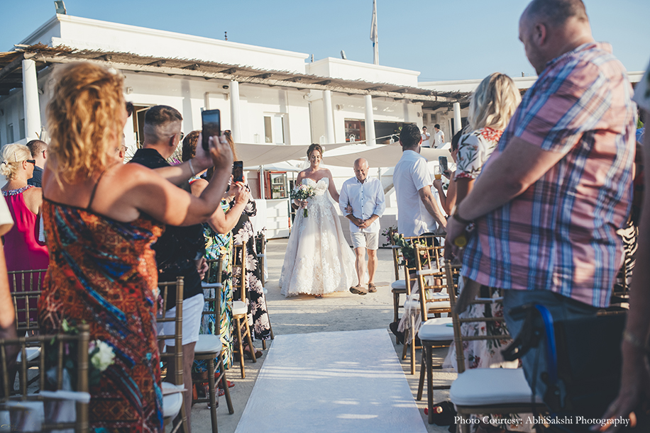 They picked Baia Beach Club in Malta for the wedding as it offered a breathtaking backdrop of the clear blue waters of Armier Bay. Keeping in mind the vibe of the venue, the theme for the wedding was ‘Beach Chill’. The couple decided to keep the decor subtle and minimal to not take away from the natural beauty of Armier Bay. Candles and flowers were extensively used for decorations that fit the sunset ambiance. Going with the relaxed mood, Ashley made an entry to the venue on a yacht, drinking with his groom’s squad. He wore a plain white shirt with beige shorts. All the groomsmen were dressed in similar co-ordinated outfits. The bride, on the other hand, looked stunning in a dreamy white bustier gown with floral motifs and a long train with a white net veil. She entered the venue in a red, open car, and was escorted by her father till the altar where the couple exchanged rings against the azure waters at the golden hour.