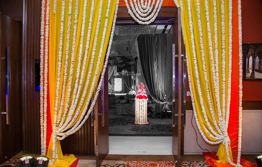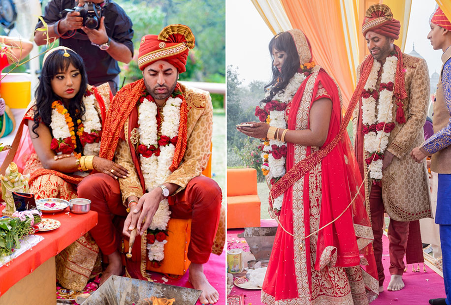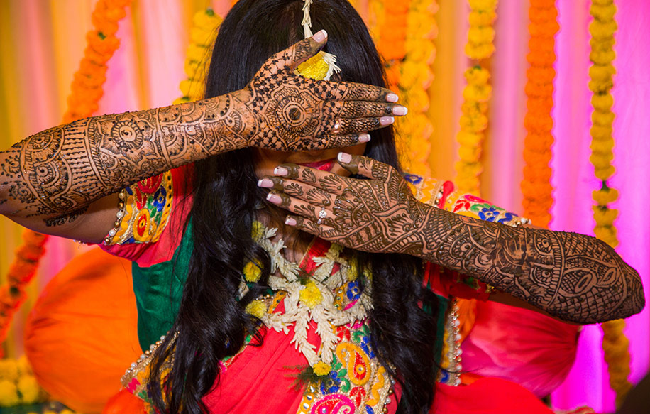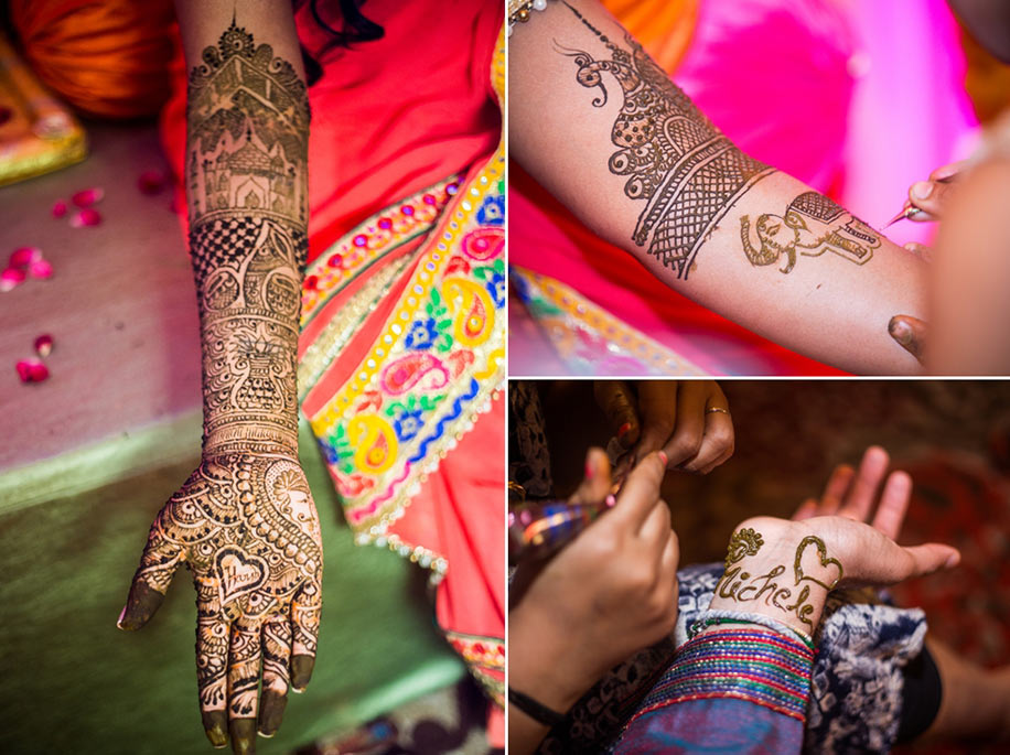 “Our Mehndi took place in the Grand Ballroom of the Courtyard Marriott hotel in Agra. The décor was done entirely in various bright regional flowers that beautifully complemented the overall pink, yellow and red drapes in the center stage. Lots of colors were added to show the vibrant colorfulness of an Indian wedding. For the Mehndi event, I wore an orange sari with floral borders and accessorized my bright attire with handmade floral jewellery from Delhi.”