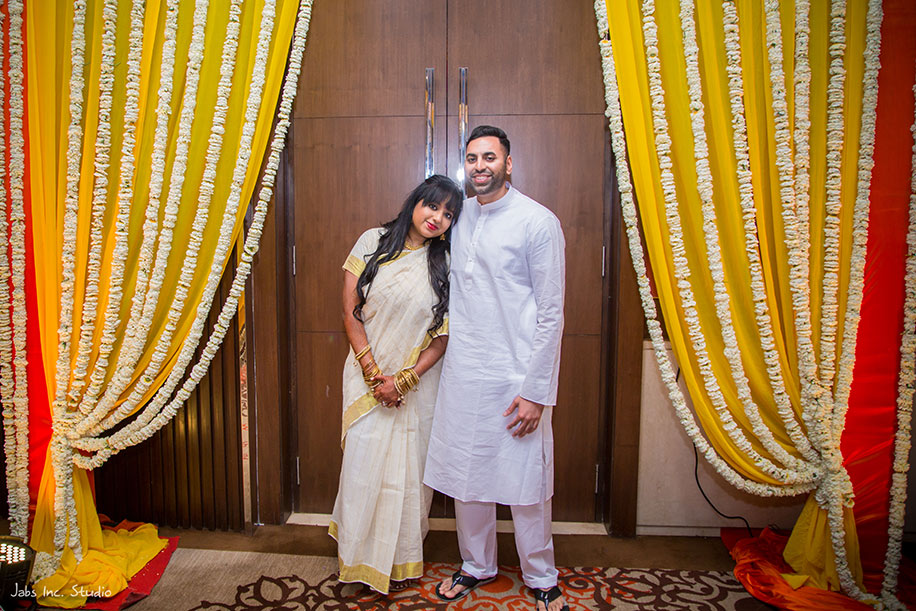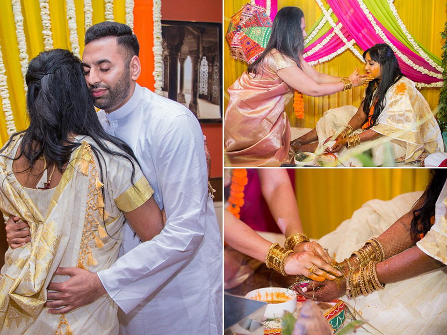 “The following day was the Pithi/Maticore, where turmeric paste was smeared on our faces, arms & legs. Per tradition, Harsh and I had our Pithi ceremonies separately and did not see each other until our wedding day. Since this was a relatively simple event, I wore a white and gold sari from a boutique in Chennai and accessorized with heavy gold bangles.”