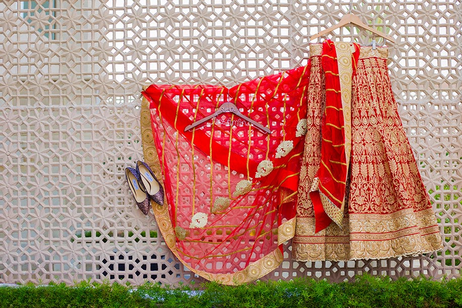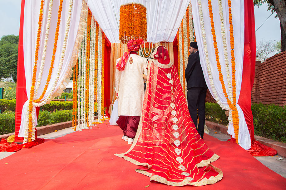 I had always envisioned myself in a customary red lehenga with gold embellishments and was happy to have found one at a boutique in Amritsar. It was gorgeous and it complemented my heavy, gold bridal jewellery. My ‘royal-styled’ wedding train was designed via conversations over WhatsApp between my mother in New Jersey and Prerna Bharadwaj, a designer in Delhi. The embroidery on my train represents patterns from the Taj Mahal. This was the first time anyone had ever seen an Indian bride with a wedding train. Everyone was mesmerized!”
