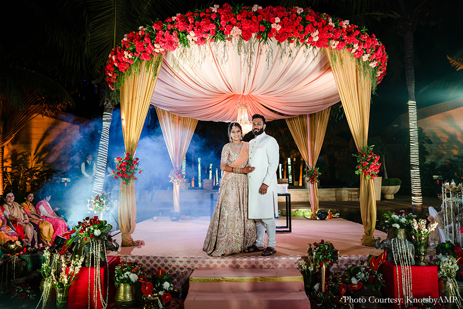 After a vibrant journey through the cities of the world via the themes of their functions, Nihar and Miloni tied the knot in a ceremony inspired by their new home – Mumbai. Riding in on a shiny red mountain bike, the groom’s ivory and blush ensemble matched the bride’s pastel lehenga by Kalki Fashion perfectly. Donning a custom made sherwani, the couple’s fur baby Rancho completed the family picture.