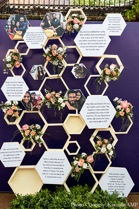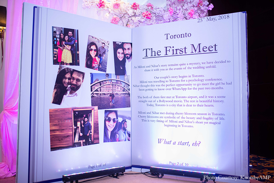 Miloni and Nihar decided to tell their story chronologically through their wedding events. Each event was inspired by the cities they met and spent time in. The chapters for each of the five events were written and edited by the couple and published in a lifesize book that was erected at each event.