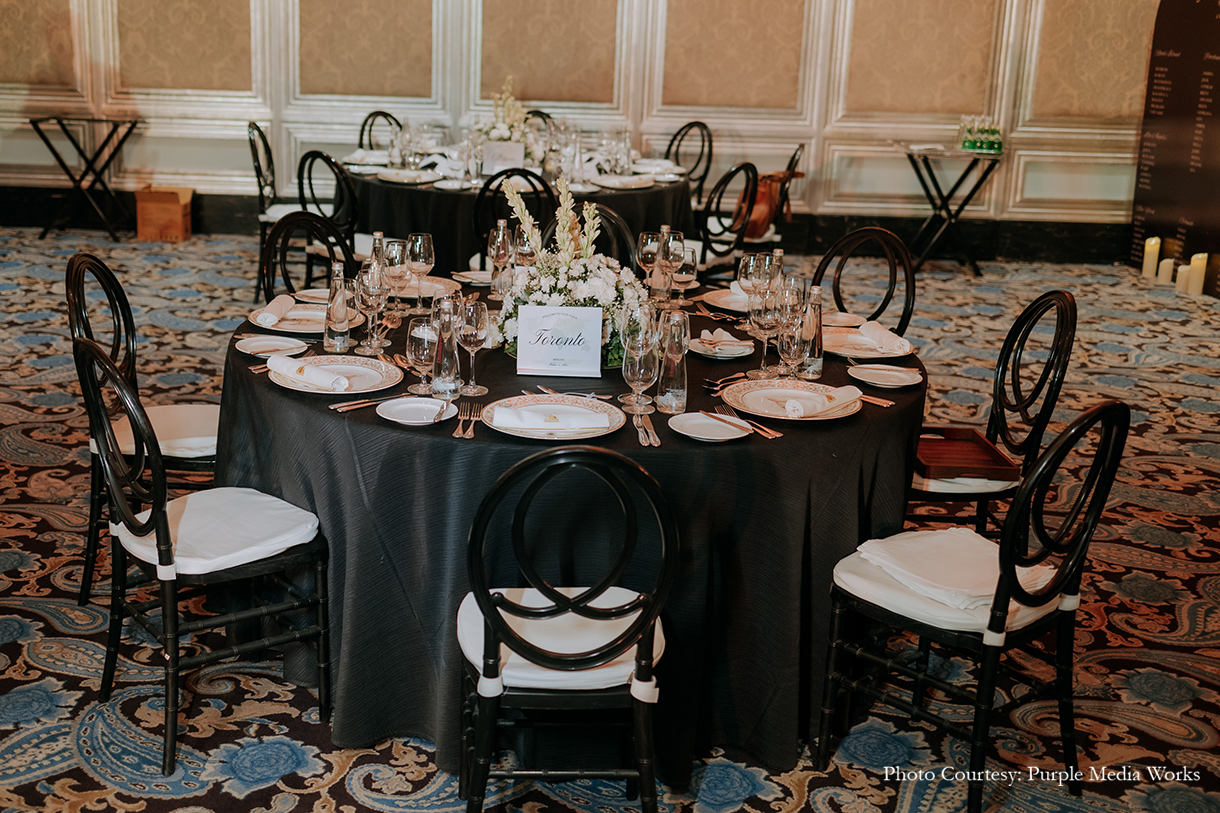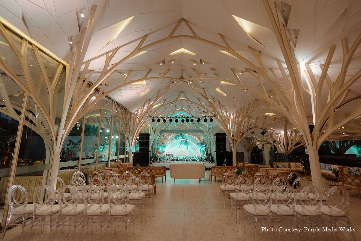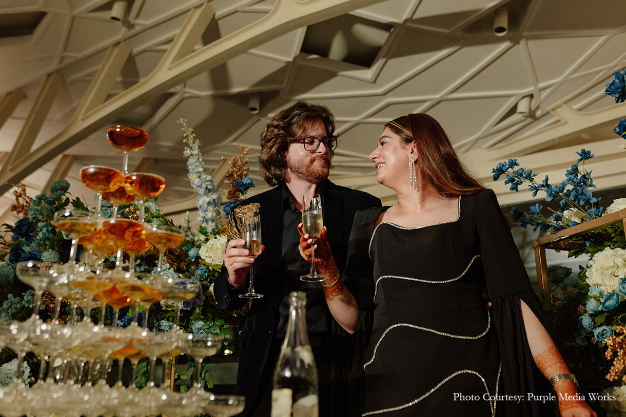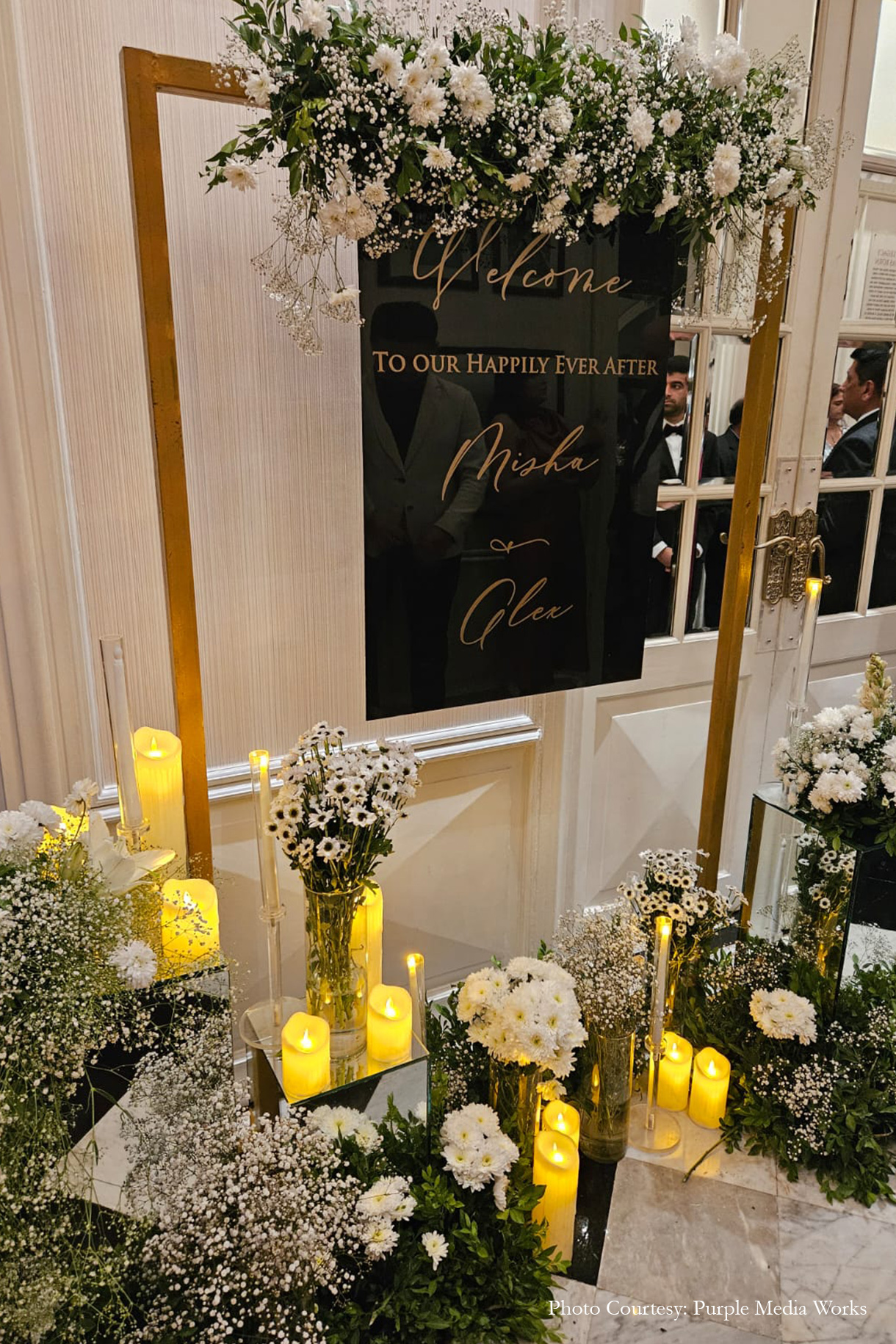 The Sangeet was a spectacular blend of glamour, music, and heartfelt moments, setting the stage for an unforgettable evening. Nishi recollects, “Misha & Alex made a show-stopping entrance and filled up a champagne tower, a moment that was dramatically enhanced by cold pyros and low fog effects, creating a cinematic celebration. The DJ and percussionist duo kept the dance floor alive, while family performances on nostalgic retro songs added a touch of warmth and sentiment. A selfie mirror photo booth captured candid moments and a personalized guest book preserved heartfelt messages for the couple.”