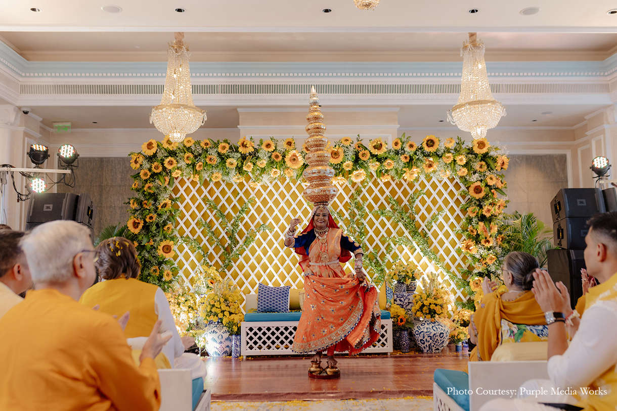 The Haldi ceremony was a joyous celebration infused with Rajasthani charm, where tradition met cultural vibrance. Guests were welcomed with fragrant floral ‘gajras’, while a lac bangle-making station offered a cherished keepsake. The event came alive with graceful Marwari and Ghoomar dancers, bringing the spirit of Rajasthan to the forefront. Nishi adds, “The highlight was the ‘Phoolon Ki Haldi’, where instead of turmeric paste, the couple was showered with fragrant flower petals, creating a picture-perfect moment filled with love, blessings, and vibrant colors.”