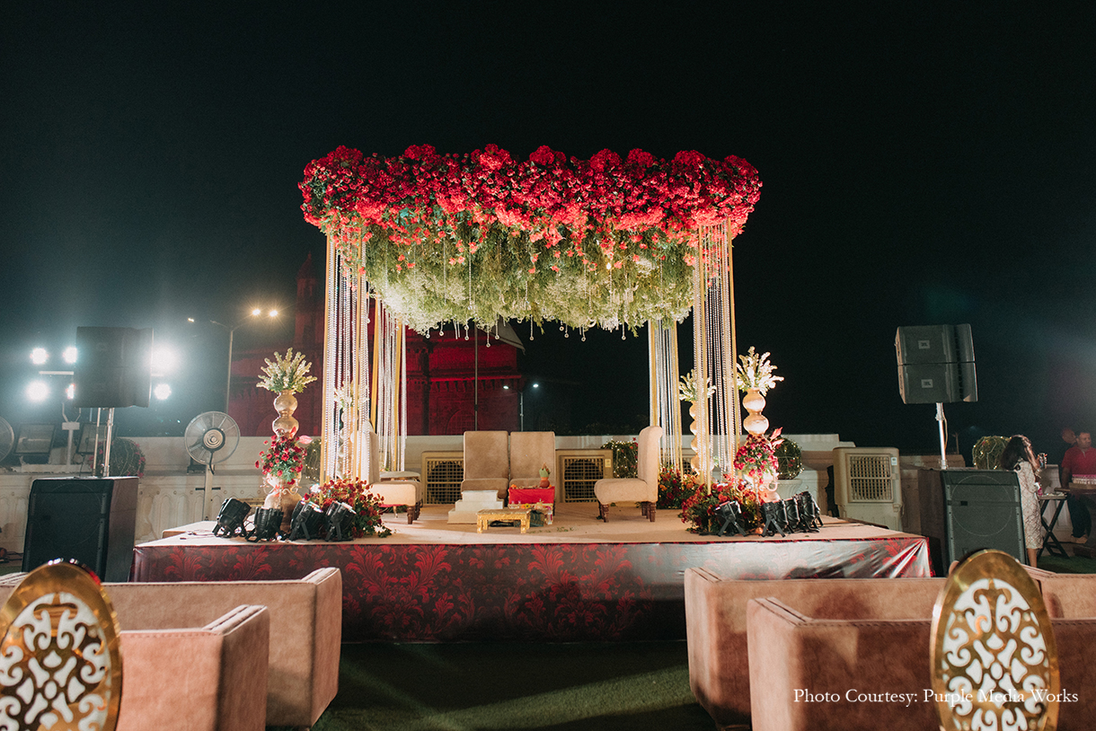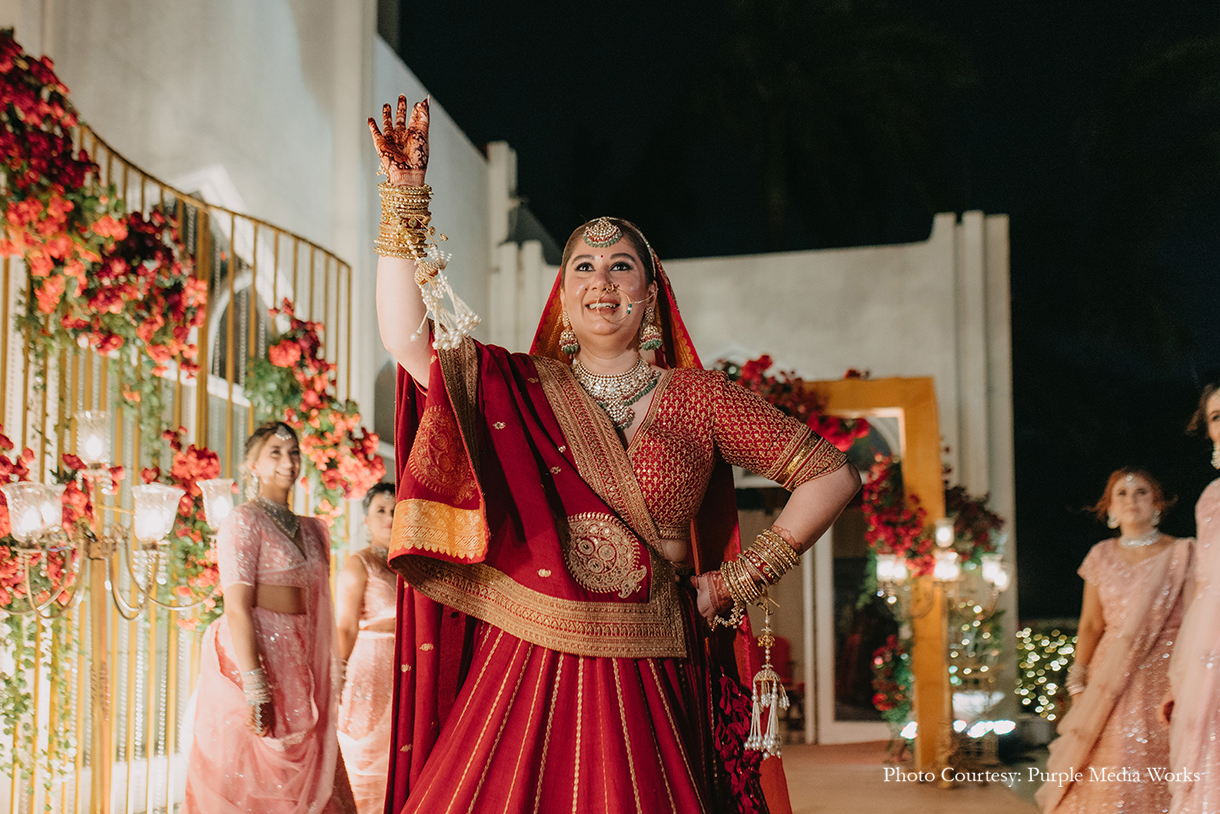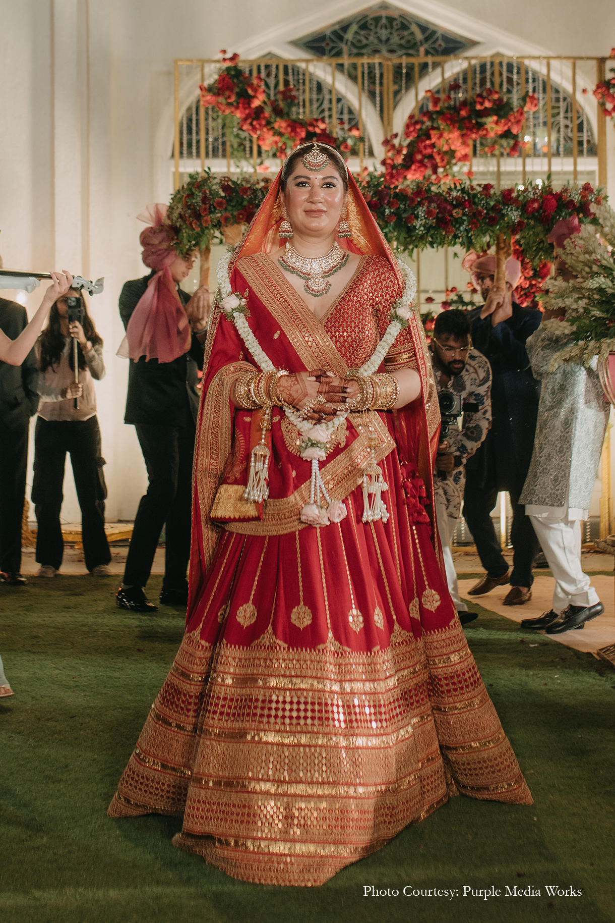 Nishi says, “The Hindu wedding was more than just a ceremony; it was a lesson in love and tradition. Set against a majestic backdrop of the Gateway of India, it was a breathtaking blend of grandeur and heartfelt customs. Alex’s baraat arrived in a vintage car, accompanied by the beats of dhol and pyro guns. The mandap, adorned with deep red roses, symbolized love and passion as the couple exchanged vows serenaded by the soulful melodies of a violinist. Lighthearted moments like the ‘Juta Churai’ added laughter, while the Kalira ritual was given a fun twist—where instead of the traditional blessing, Misha playfully shook her ‘kalireein’ over her bridesmaids to reveal the next bride-to-be. The varmala exchange under a spectacular floral shower created a cinematic memory.”