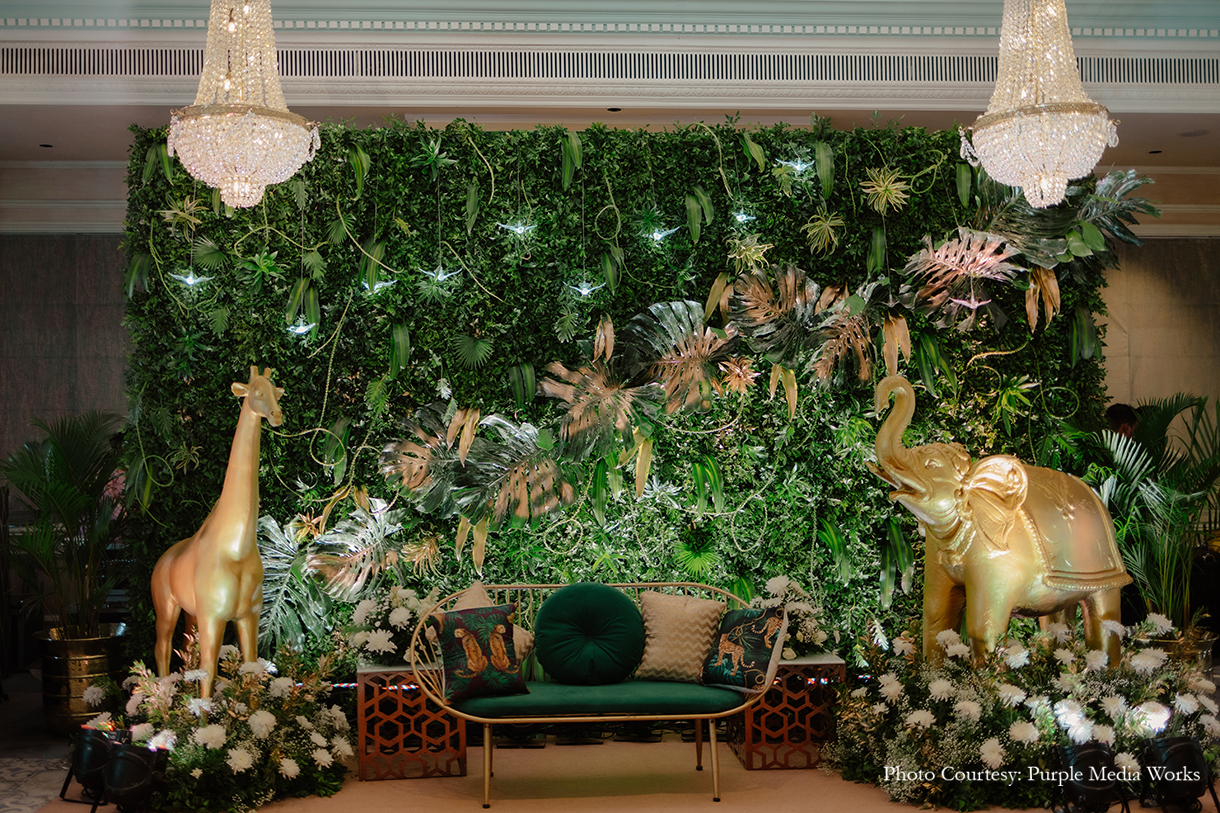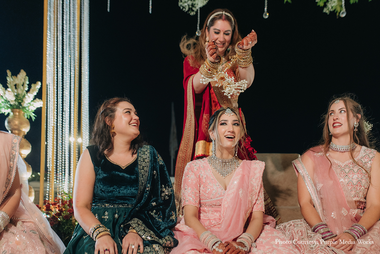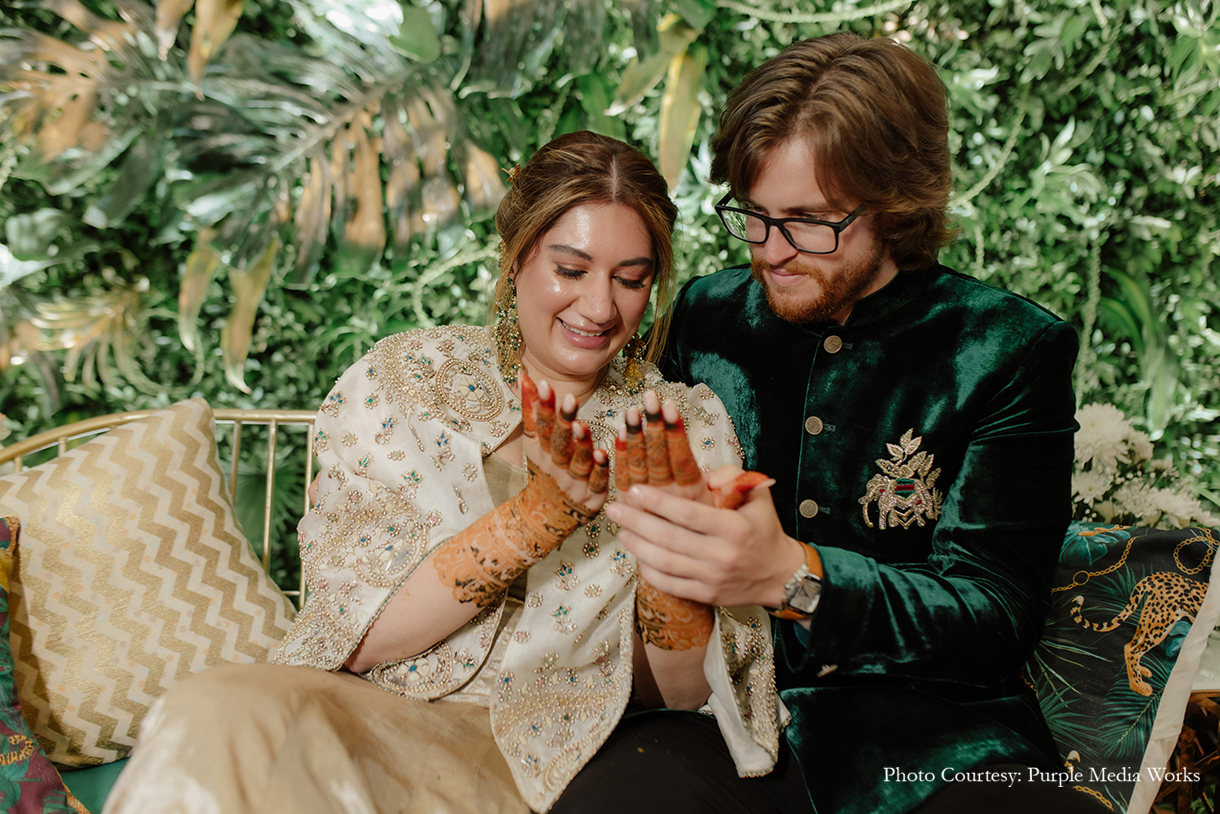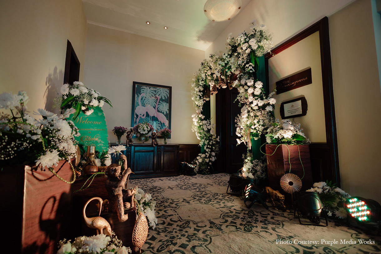 “Misha and Alex’s Mehendi celebration was nothing short of magical, transforming the venue into an enchanted forest with lush floral installations, whimsical décor, and playful monkey props. Traditional ‘swaagat malas’ welcomed guests, setting the tone for a culturally immersive experience. Guests indulged in creating their personalized fragrance, while a fortune teller added a fun mystical touch, making the event both interactive and unforgettable. Our international guests enthusiastically embraced the tradition of applying Mehendi, whether men or women, adding to the vibrant cultural exchange”, shares Nishi.