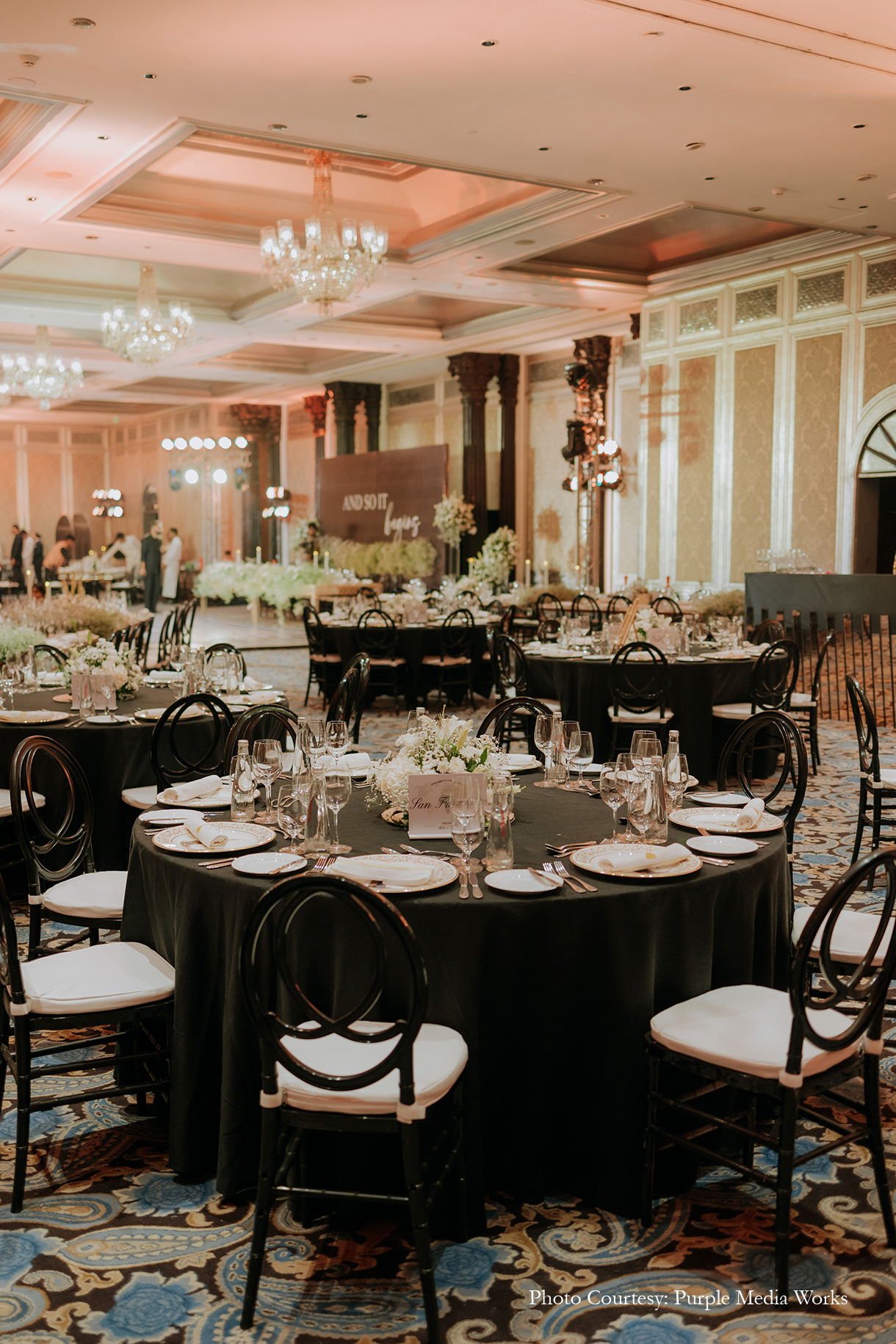 Intimate yet grand, the Christian wedding embraced sophisticated minimalism with dashes of personalisation. Guests were seated at tables named after destinations from the couple’s honeymoon itinerary, turning the reception into a glimpse of their future adventures. A sit-down dinner enhanced the sense of intimacy and sophistication and the couple’s LED glow-stick entrance transformed the venue into a sea of twinkling lights.