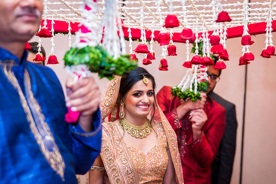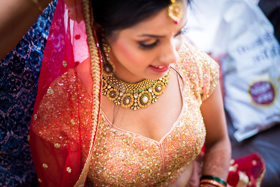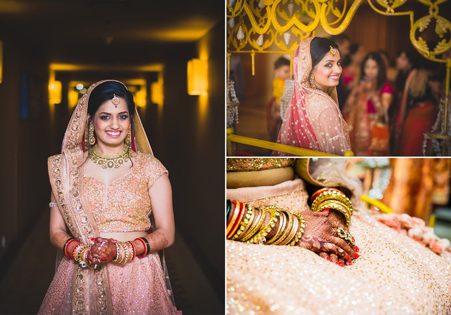 “After a couple of religious rituals and ceremonies at home, our wedding festivities began. Viraj and his entourage made their entry dancing to the infectious beats of the ‘dhol’ (traditional drum). The elegant and sophisticated floral decor was done by National Decorators and truly complemented our aesthetic tastes. After the pheras, we even had a fun game where my side of the family hid Viraj’s shoes and asked his family to find it. The stealing of the ‘mojris’ (ethnic shoes) and bargaining of money for them were one of the most fun moments of the entire wedding. I am quite minimalistic when it comes to my fashion and beauty tastes, so I wore an embellished blush gold lehenga which I paired with gorgeous jewellery from Coral Jewels. Viraj wore a white sherwani with a majestic red ‘safa’ (turban). My bridal look was kept natural for which I cannot thank my makeup artist, Mridula Thombre enough as she made me look absolutely stunning!”