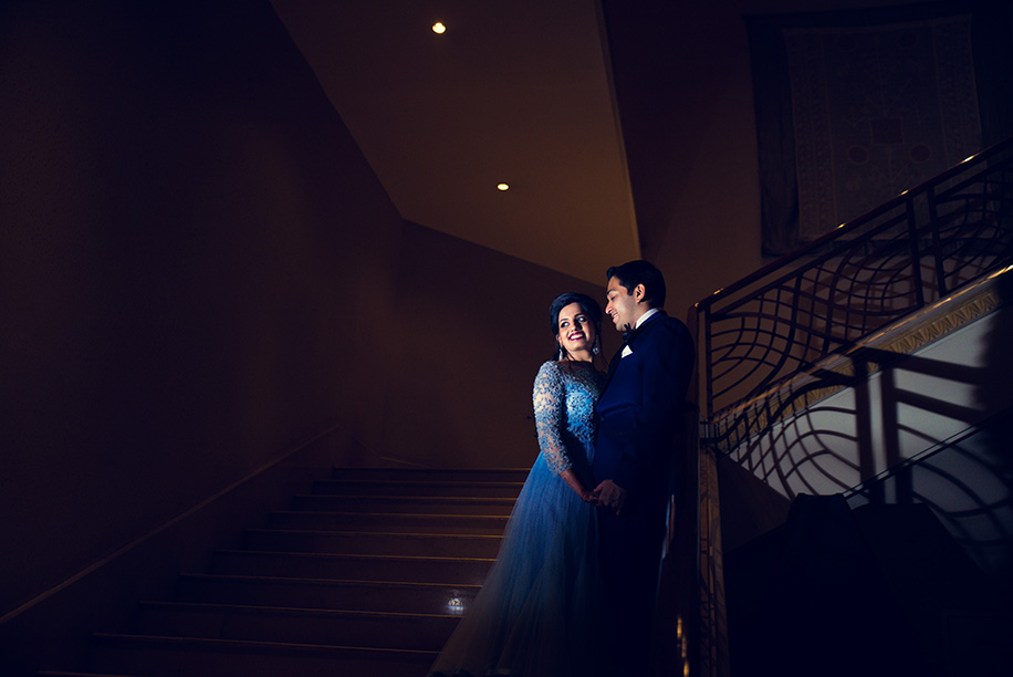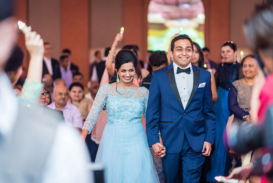 “The reception commenced with our entrance as ‘Mr and Mrs Mehta’ for the first time. We waltzed to the tune of ‘I’m Yours’ by Jason Mraz, and spent the next couple of hours greeting and meeting all our wonderful guests who had come to bless us. I wanted to look stylish yet be comfortable for this event so I wore a powder blue cocktail gown and minimal jewellery which perfectly matched Viraj’s blue tuxedo with black lapels and bow tie.”