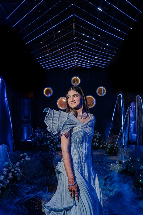 The evening transitioned into a magical starry night with a glitzy Ballroom Sangeet. In a unique interpretation of the popular cocktail theme, the mesmerizing blue decor included a startling installation of 40 chandeliers suspended to conjure an infinite line of reflections to symbolise eternity and everlasting love. The stunning hues and sheen of crystals left the guests enamored while the walls and floor exhibited an artistic rendition of Van Gogh’s starry night painting. Filled with music and merriment, the evening was sparkle galore.