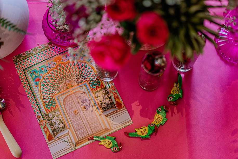 Kicking off the festivities was the lively Rajasthani mehndi soiree, bursting with joy and color. To introduce the glory and heritage of Rajasthan to the guests hailing from Chennai, the function was spread across 3 venues, each of which was imagined as an iconic Rajasthani city, rich in culture and architecture. The Jaipur pavilion reflected the beauty of the pink city with gota work, gudda guddi crafts, traditional kathputli, wooden crafts, and more. Imagined in a palette of blue and sandstone, the Jodhpur arena was filled with block prints and elephant motifs. The Jaisalmer pavilion celebrated the colors and crafts of the city with vibrant upholstery, local arts, camel-inspired decor, saafas, flower vases, and more.