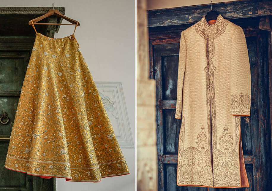 Monica’s wedding lehenga was designed by Manish Tripathi under his label Naveli. This rich yellow and orange ensemble was paired with a red ‘bandini’ dupatta that glinted with a shimmering gold border. The deep gold jewellery complemented the lush richness of the fabrics, and Puneet’s light brown sherwani with all-over gold threadwork, standout motifs and light brown ‘safa’ complemented Monica’s look perfectly.