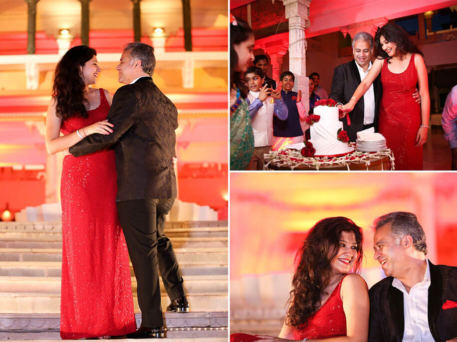Monica wore a formal glittery sleeveless red gown and Puneet donned a smart black suit with a crisp white shirt for the Western-themed cocktail party that was buzzing with champagne, a beautiful white cake with red roses, and lots of cheery spirits as guests enjoyed themselves in the beautiful ambience of this heritage hotel.”