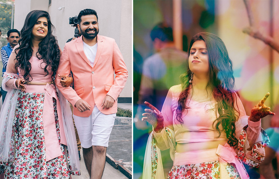 “Our wedding festivities commenced with a pool party where everyone enjoyed with music, food and drinks. I wore a floral pink skirt from Kalki Fashions and styled my hair in waves, while Karan wore a pink Burberry blazer.”