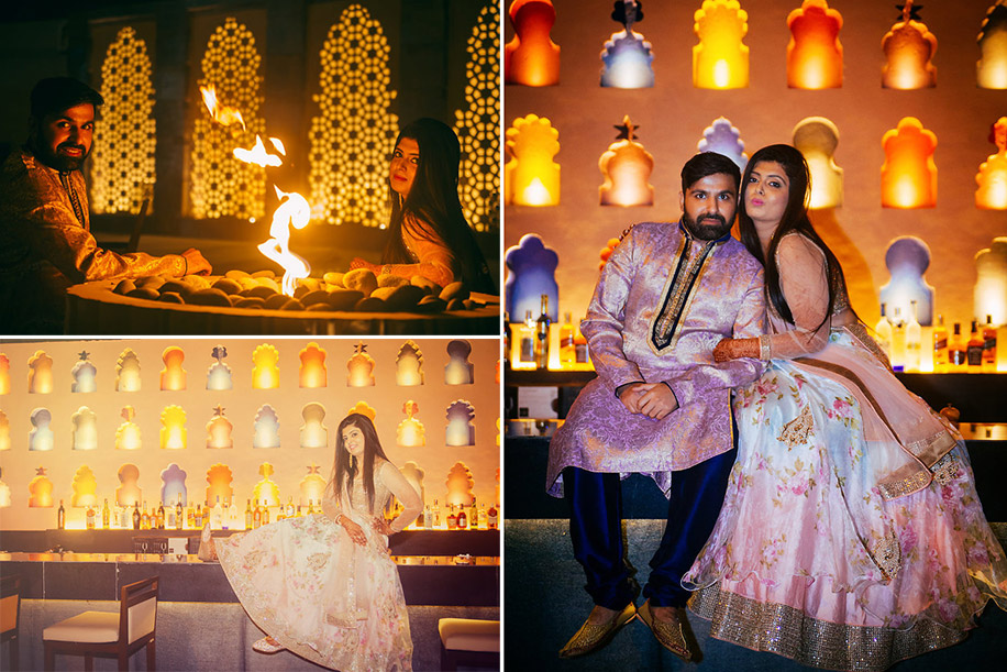 “We held our mehndi function at the Anise Restaurant in the hotel. The function had a Punjabi theme and a rustic village setting with a photobooth, marigold flowers and colorful umbrellas. We had a troupe of sardar dancers who entertained everyone with their bhangra performances. The food served was spicy Punjabi cuisine, and in the evening, we lit ‘mashaals’ (flame torches) in the restaurant. I wore a sea green floral dress from Anushree, and Karan wore a kurta from Telon in Mumbai for our photoshoot. This function was very memorable as Karan surprised me by proposing to me in front of everyone. The track that played in the background was “Will you marry me”, and when he gave me the ring, and the song changed to the Bollywood number, “Tu tu meri main tera hone laga.”
