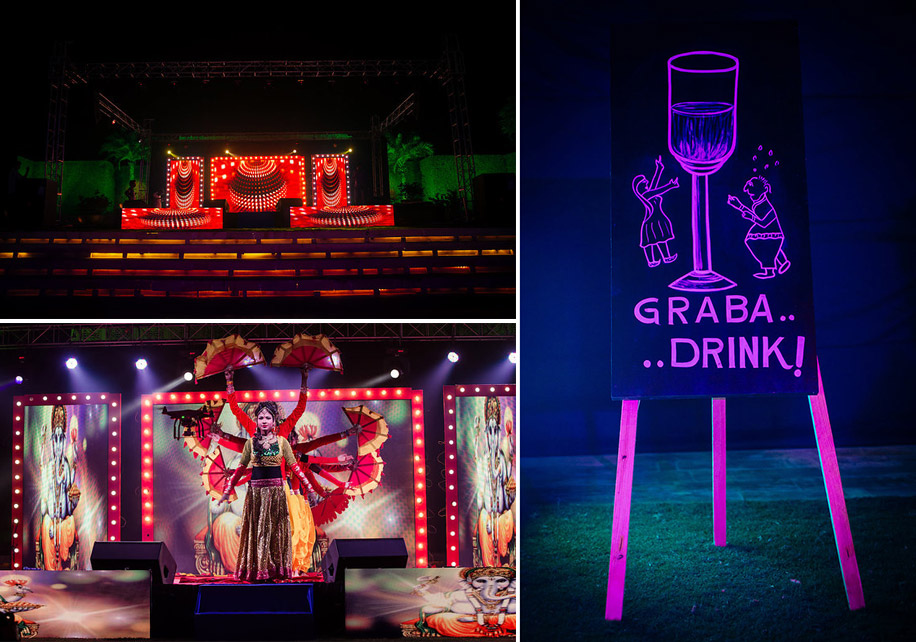 “The sangeet set up was completely draped with a red and black theme like awards function set, with the director’s box saying “Action”. The entrance had my photos alongside Ranbir Kapoor’s images ( as he is my only favorite) on long boards. The big stage and super sounding acoustics was perfect for a crazy time with lots of music and dancing! I chose to a wear a digital print tail skirt with a sequined blouse designed by Archana Kochhar, and Karan wore an ensemble from Telon.”