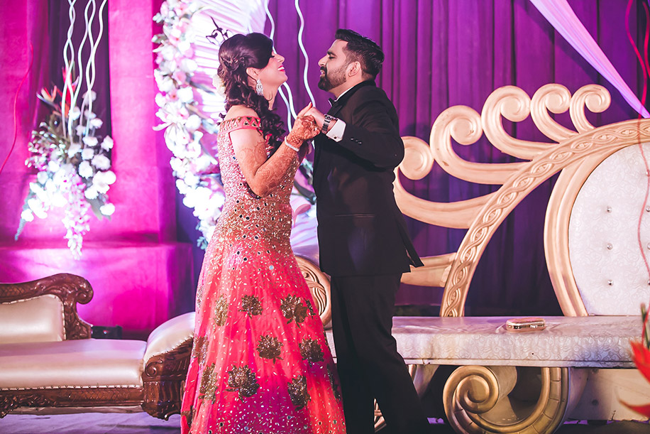 “My reception was like a page out of a fairytale! There was a Cinderella carriage with wonderful dancers welcoming is. I felt like a princess when Karan – my Prince Charming – came to escort me. My long, pink off-shoulder tail gown by Yoshita Couture and Karan’s black tuxedo from Kora Men’s Fashion with a pink pocket square complemented each other perfectly.”