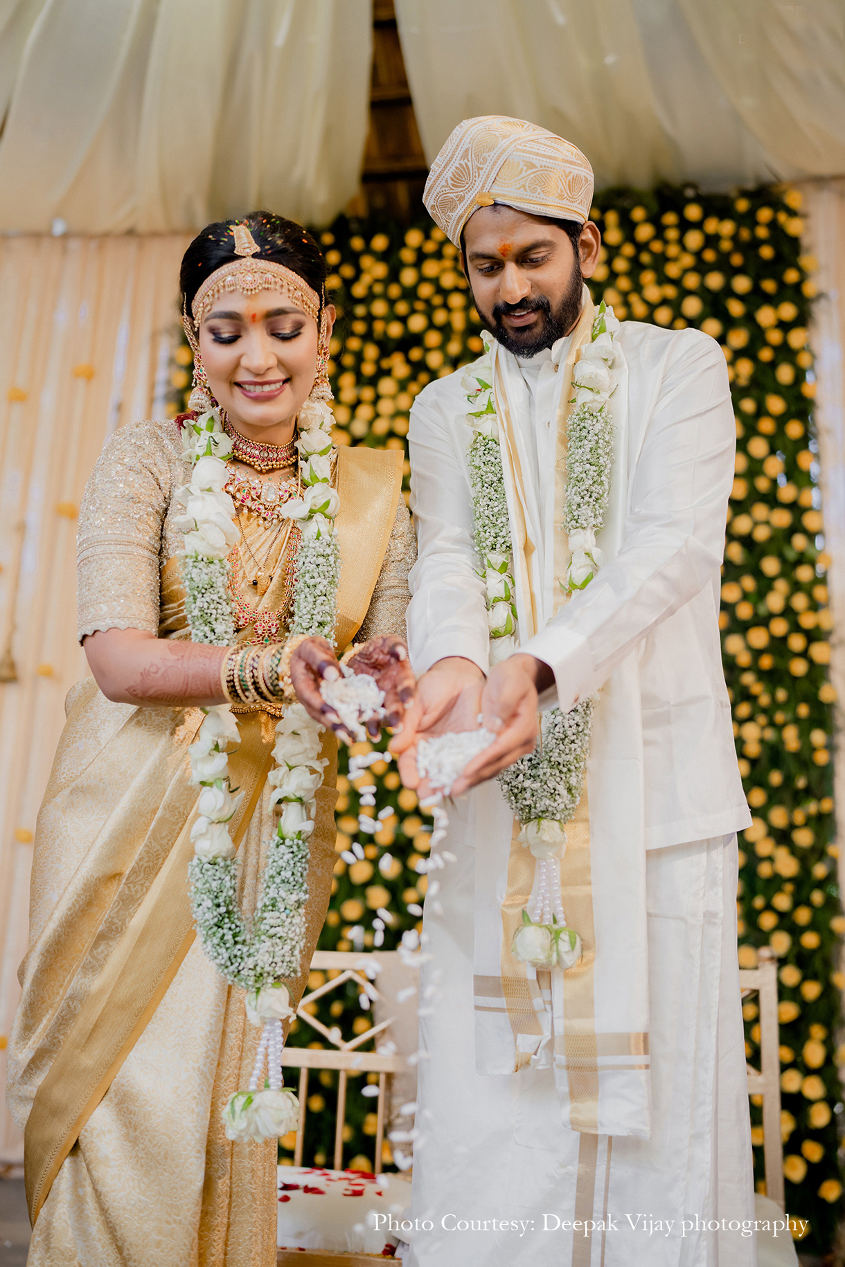Hosted outdoors, the tranquil garden wedding was imagined in a refreshing palette of white and yellow that crafted the perfect blend of modern and traditional, while adding a sunny pop of color to the lush greenery and earthy aesthetics of the property. Floral rangoli art, garlands, drapes, and ornate brass wedding elements across the home-style boutique venue recreated the nostalgia and warmth of getting married in your ancestral home. The bride and groom matched the tone of the day in cream and gold as they tied the knot in the beautiful gazebo mandap surrounded by their loved ones.