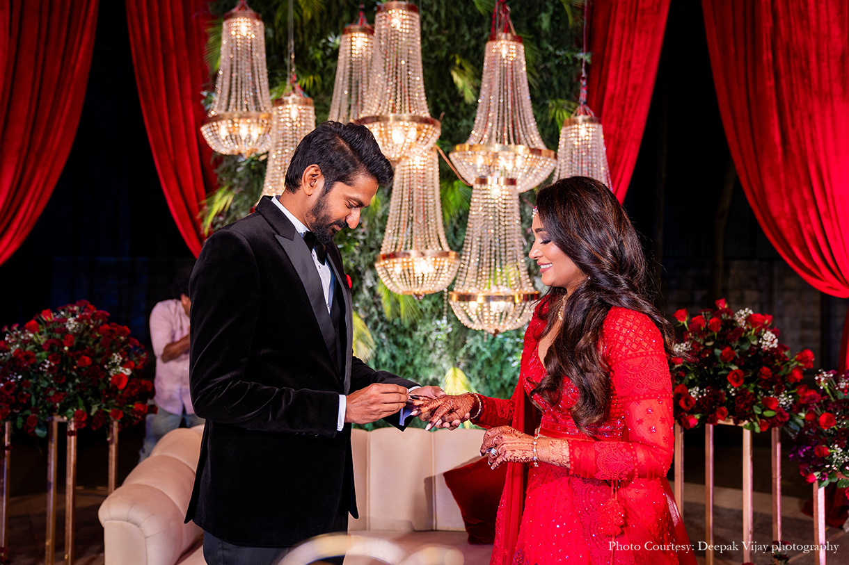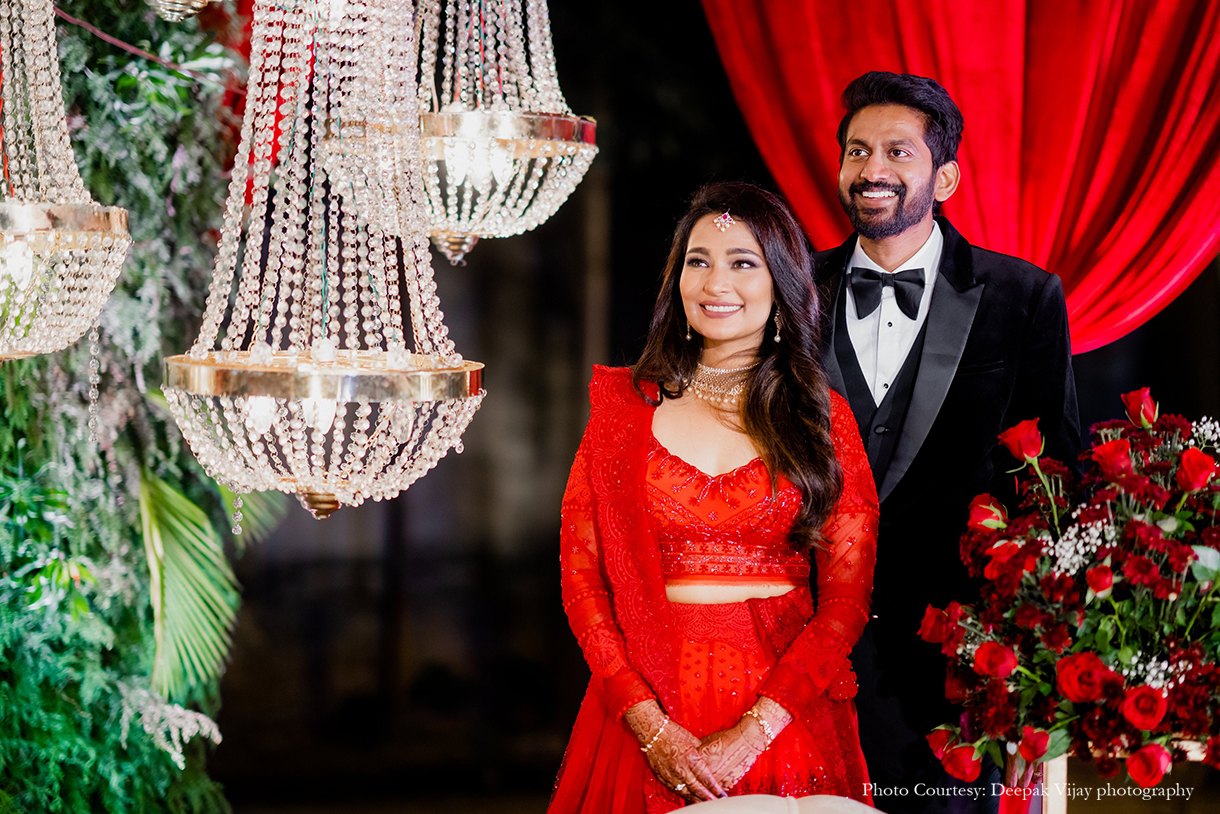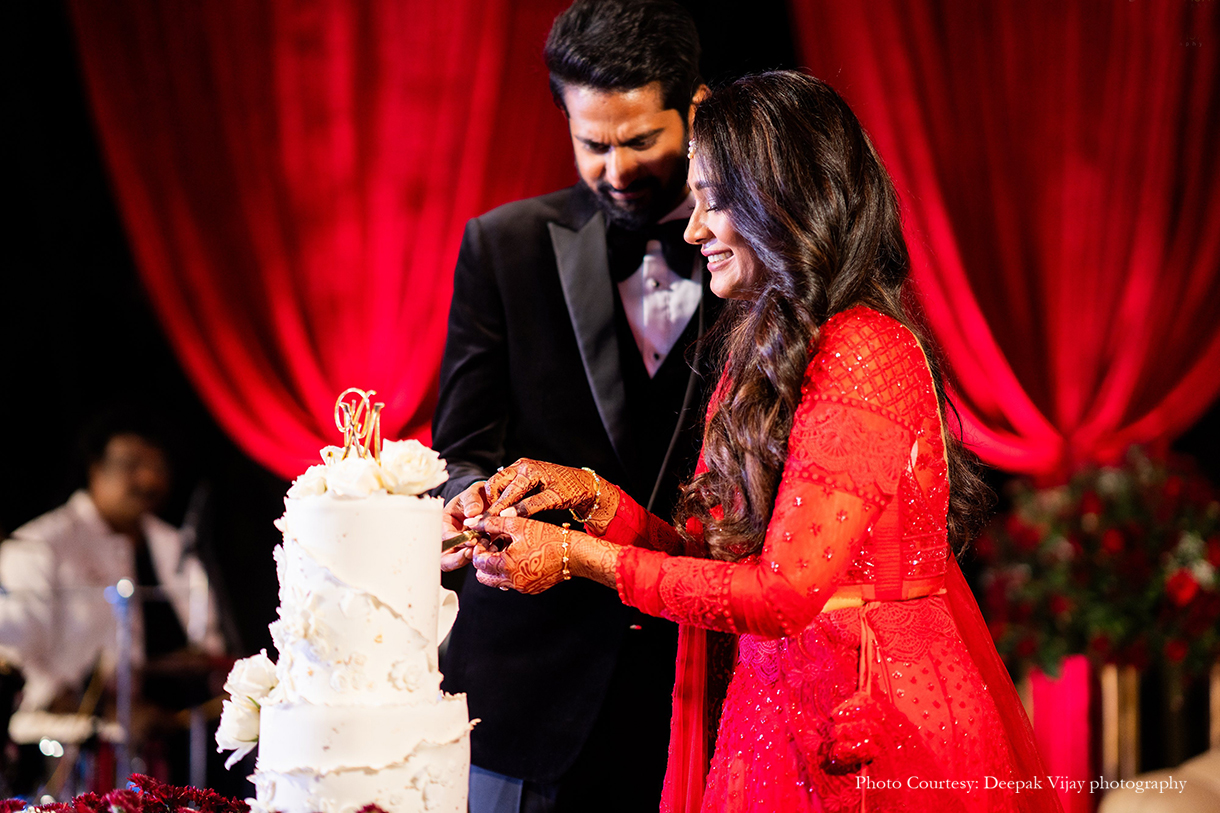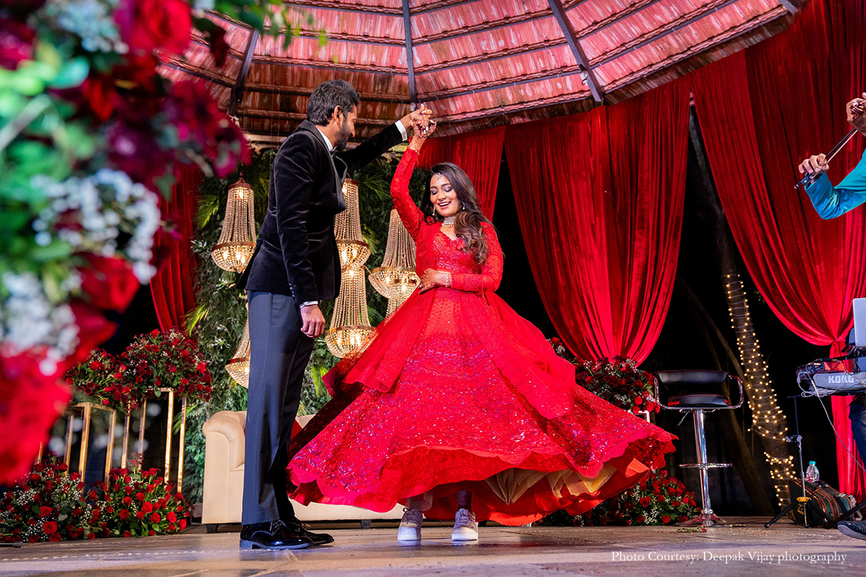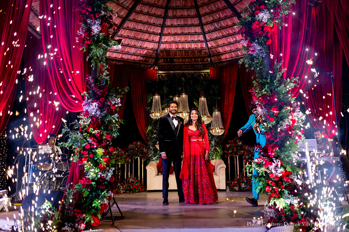 The traditional warmth of the wedding ceremony was replaced by cocktail glamor as the evening transitioned into the Reception dinner. Rich hues of red amped up the elegance in the form of exquisite floral arrangements and plush drapes, while glittering chandeliers and a canopy of fairy lights lit up the night. Dressed in the classic evening combination of red and black, the bride and groom entered amidst great cheers as a violinist serenaded them. The evening continued with a live band, toasts, laughter, and cake-cutting as everyone celebrated the newlyweds.