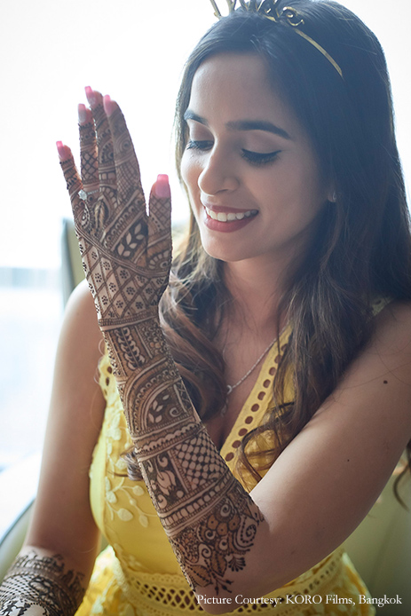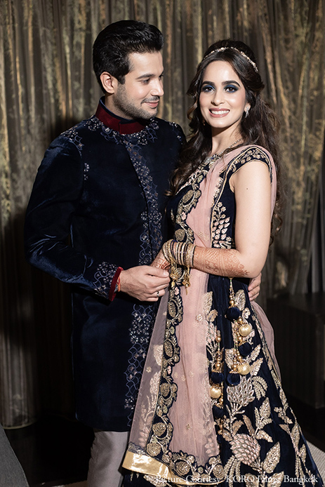 The couple hosted a romantic soirée aboard the Grand Chaophraya Cruise and conducted the ring ceremony and Monisha’s mehendi party on the iconic river. Dressed in shades of blue, guests had a wonderful time celebrating Monisha and Nikhil’s engagement and getting their hands inked with henna. DJ Ash entertained the guests with his thrilling beats and the wedding brigade danced the night away.