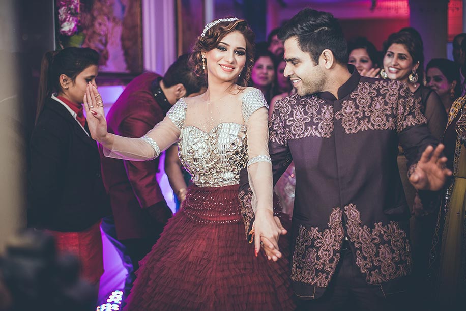 “Our sagan was held at The Maiden Crown in New Delhi. I wanted our decor to be simple yet trendy and he wanted it to match our dress code. So we ended up having traditional decor with hints of Imperial Red, which was also the colour of my gown. I wanted my sagan dress to be unconventional – sort of with a fairytale vibe – so I designed it accordingly,” recounts Moonisha. The flouncy red skirt of her gown was paired with a short-sleeved silver top studded with glass work. She opted for a side bun with a fancy silver hairband as she wanted a “soft and modern look to match my Western gown”. Jitin Rathore transformed Moonisha into a modern-day princess with make-up and teased soft curls to frame her face. Chirag wore a dark brown bandgala suit with light brown patterns.