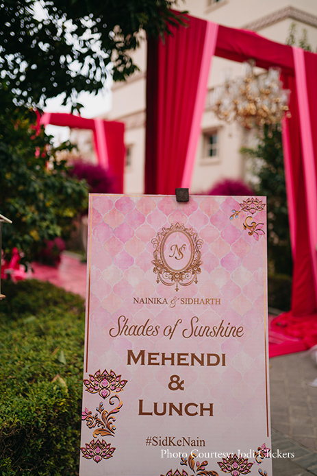 Aptly named the ‘Shades of Sunshine’, the vibrant Mehendi function set a joyful mood for the next day. The ‘mela’ theme reflected in the cheerful flowers, bright pink décor, signage and interesting food options, all of which were held by the poolside. The bride looked radiant in a pink Sabyasachi lehenga, while the groom teamed his white kurta with a pink Nehru jacket by Puneet Gupta.