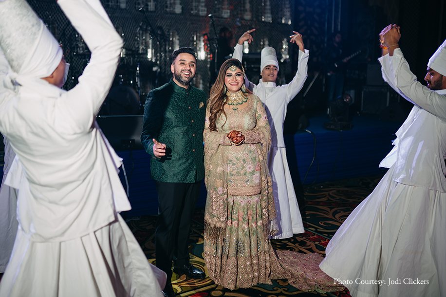 Dubbed ‘Sham-e-Nazrana’, the Sufi Night was an evening of glamour, decadence and soul-stirring music. The regal, jewel-toned décor set a charismatic ambience, with Tanoura and Dervish dancers adding to the magic. Dressed in rich green ensembles, the couple entered with Dervish dancers accompanying them.