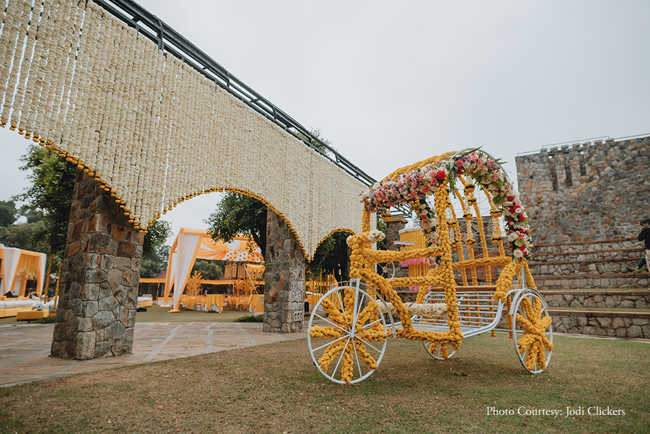 The final day began with a beautiful Haldi ceremony. The sunny, marigold décor and orange hues of the event looked magical on the rainy day. The couple and their loved ones played ‘phoolon ki Holi’ with flower petals, which was a sight to behold.