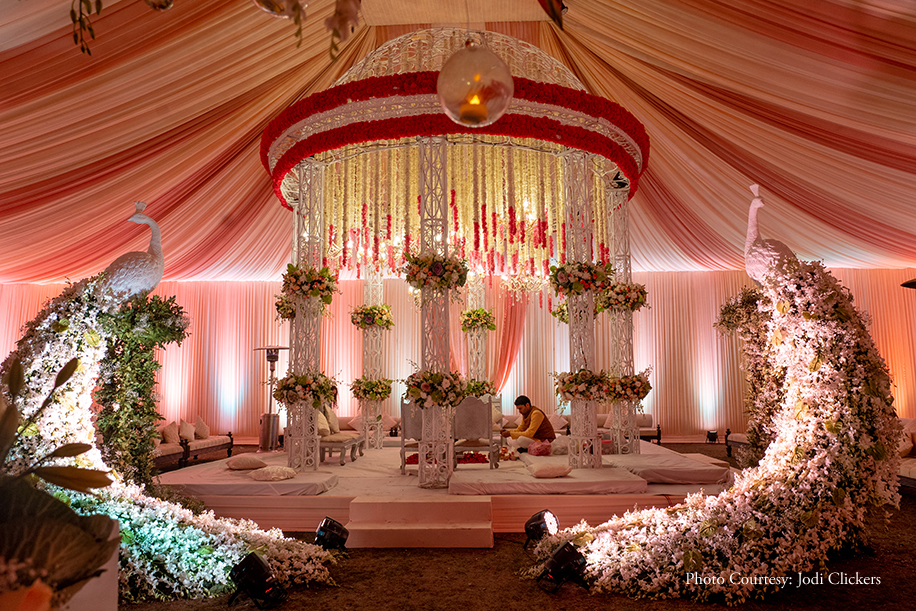 Mesmerizing peacocks and a whimsically floral canopy perfectly captured the ‘Garden of Divine Love’ theme of the wedding.