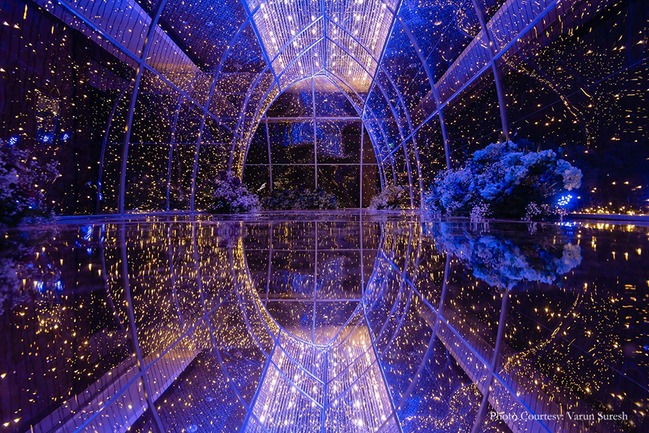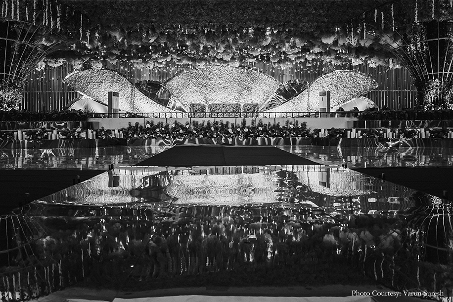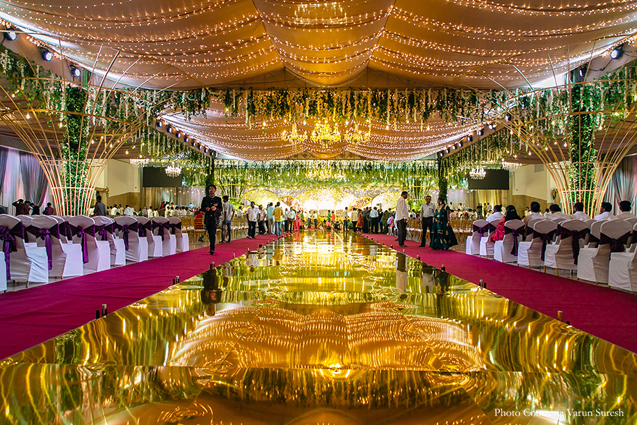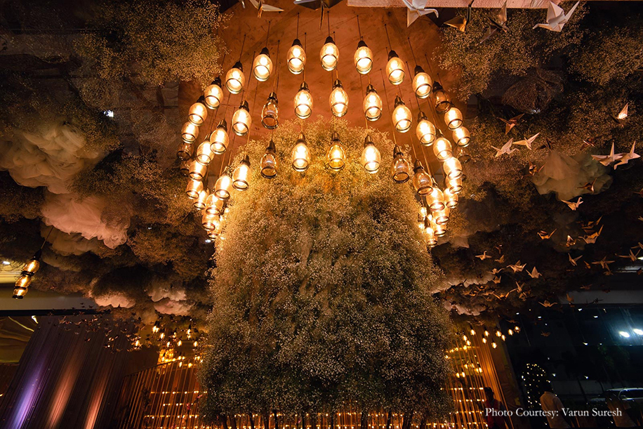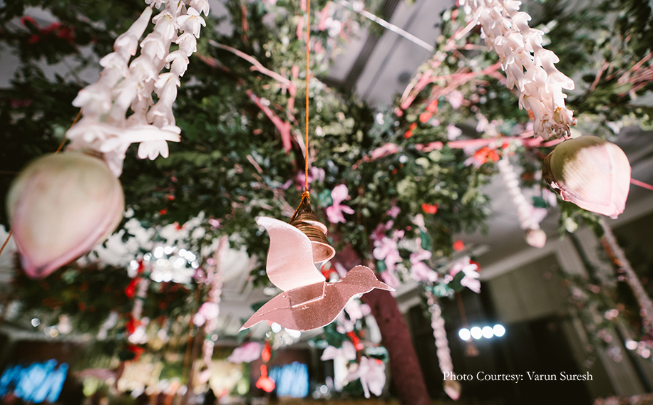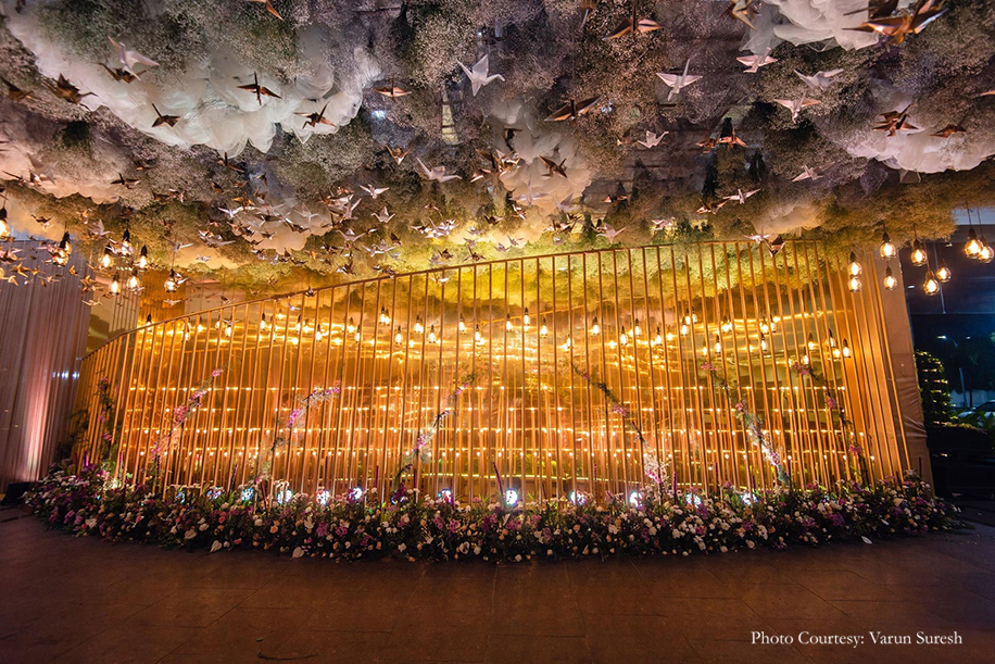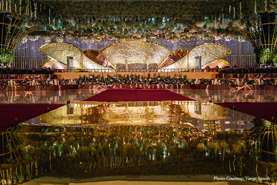 In an unusual twist, the reception function was held the night before the wedding at Ramachandra Convention Centre, Chennai. The inherent theme was Aakash (space) which incorporated a multitude of origami birds highlighted with a canopy of fairy lights and foliage over a spectacular gold walkway to the stage. The bride looked stunning in a purple custom Manish Malhotra ensemble while the groom wore a 3 piece custom Osman Abdul Razak suit.