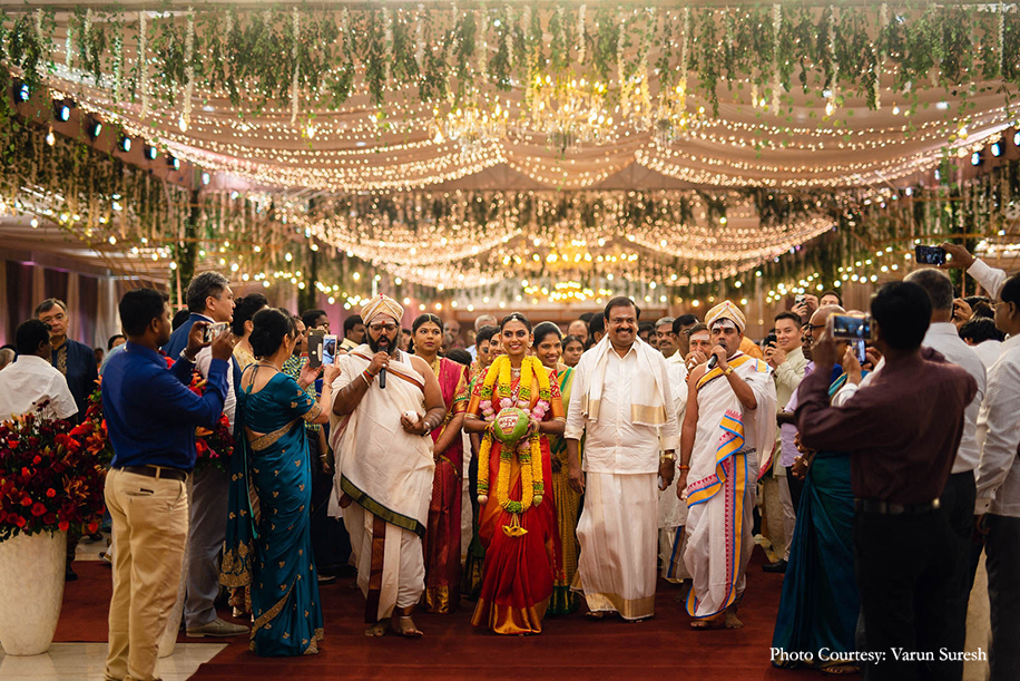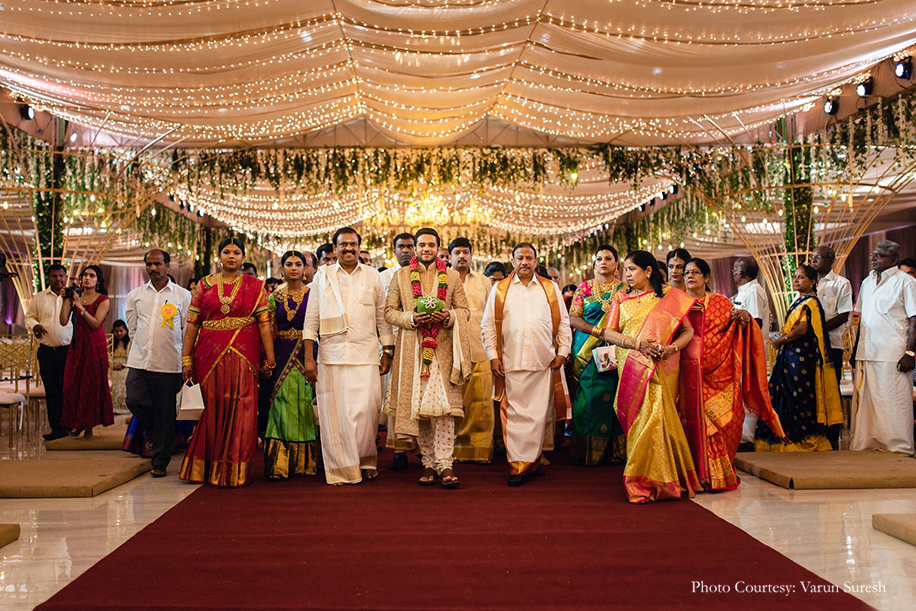 Venue: The Leela Palace, Chennai (Engagement), ITC Grand Chola (Sangeet), Ramachandra Convention Centre, Chennai (Wedding, Reception)