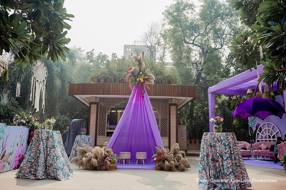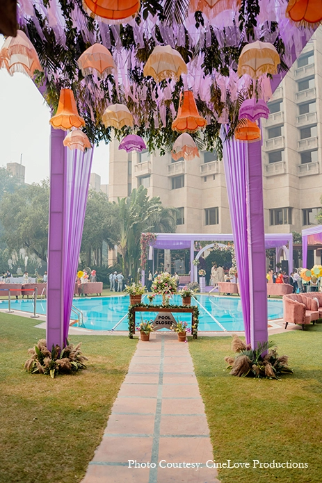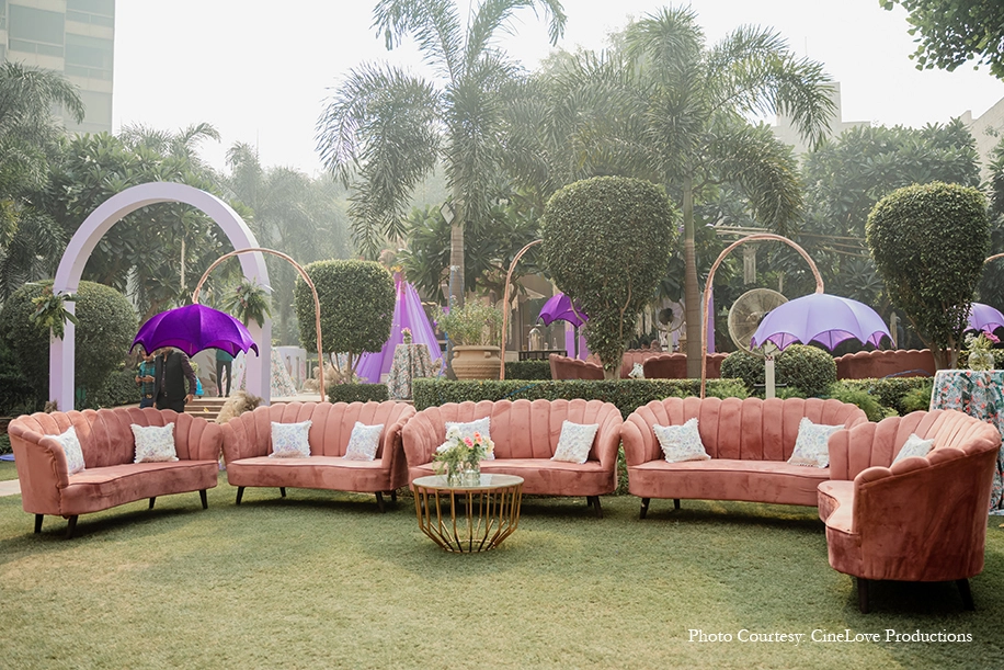 Swathed in shades of purple and dusty rose, the poolside mehndi event was distinctly feminine. Dainty pink floral with quirky props peppered the venue while comfy velvet sofas had everyone lounging comfortably. A live band kept the guests entertained while they got their palms patterned with henna.