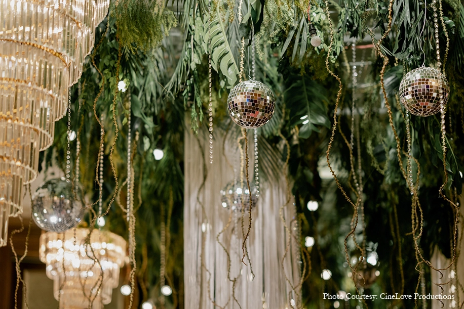 After the mehndi under the sunshine, the couple enjoyed a glitzy evening sangeet event. Keeping it subtle yet glam, the duo chose an off-white colour palette set off by green foliage. Hints of gold, disco balls, sequins and crystal chandeliers reflected the lights in the indoor venue, the Mansion Hall, to create a dazzling effect as everyone danced the night away.