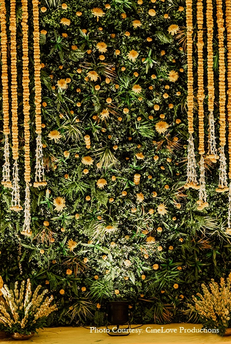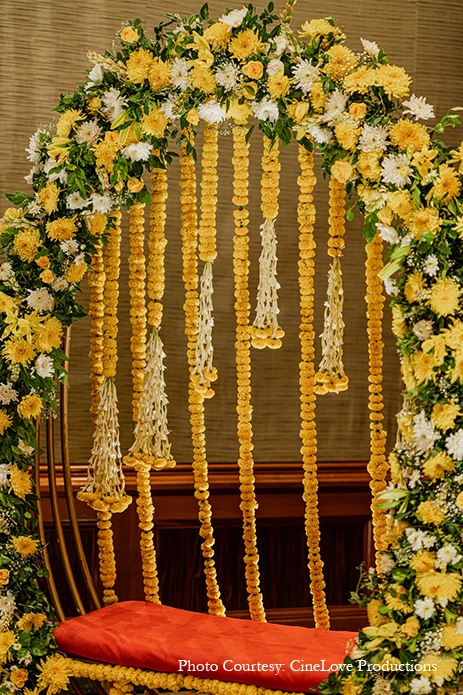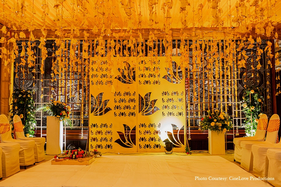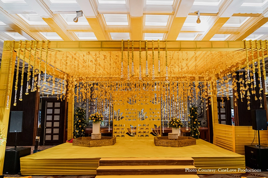 For the haldi, the couple decided to go for a yellow-hued decor replete with marigold garlands, a floral arch and a lotus cutwork backdrop. Hosted indoors within the Regency Ballroom, the haldi had everyone freely mingling as they took turns to slather the couple with haldi.