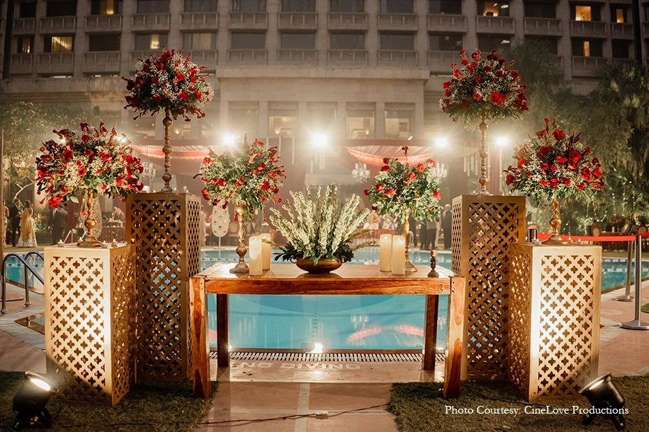 Hosted in the chilly month of November in Delhi, the weather was traditional at heart. Red and white hues dominated the color palette and stood out against the backdrop of the night sky. The poolside wedding started off with a rousing baraat and as evening fell, the venue was lit up with fairy lights that gave every picture a serene backdrop.