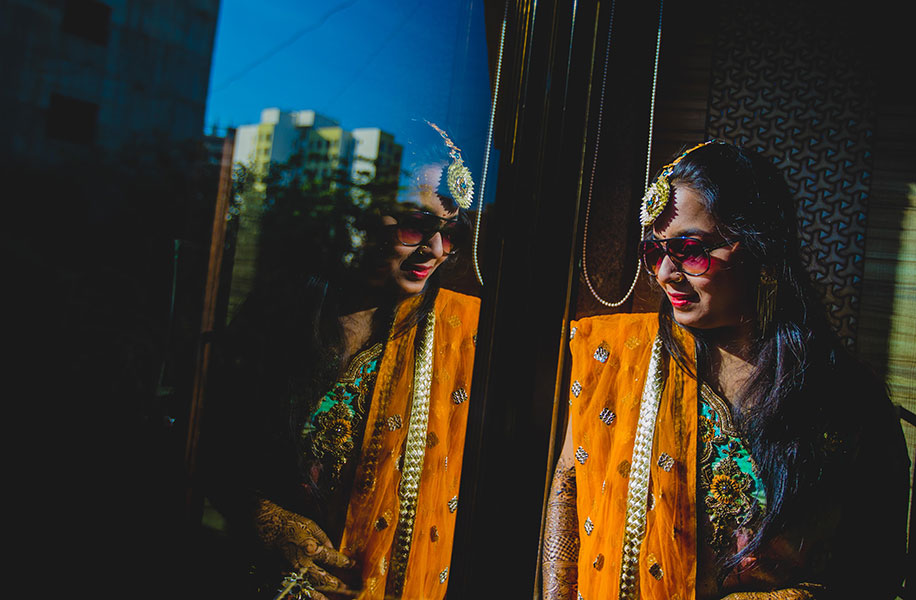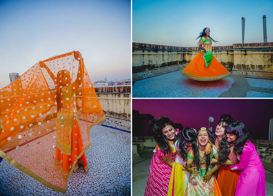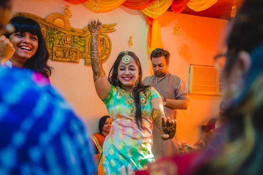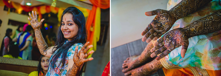For my mehndi function, I wanted to wear a brightly colored lehenga and a long kurta. I did not want it to be of the typical green color. So I teamed it up with floral accessories. The décor was well coordinated with my outfit with kaliras hanging all over.