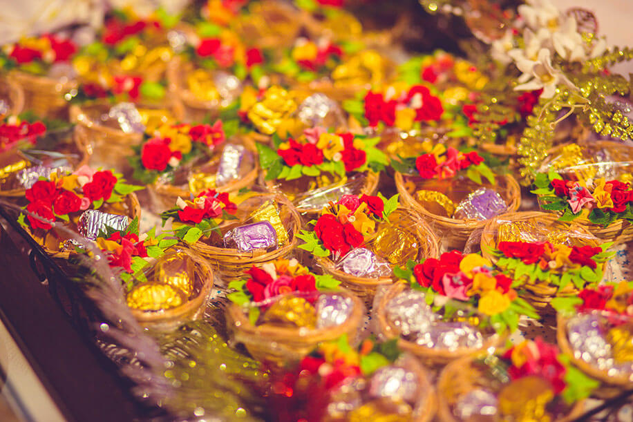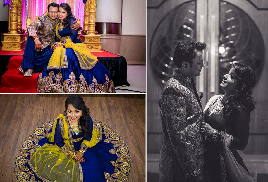 Our sangeet was different and we had a unique way of introducing all our performers. We had a flash mob performances as well as dubsmash videos before each performance by loved ones. It was well edited with their names and relationship with us, the groom and bride. For the sangeet, I wore a self-designed navy blue gown with peacock motifs at the base. My yellow net dupatta matched my jewellery which also had yellow accents. Anurag’s dull gold long jacket with blue accents complemented Narayani’s royal blue ensemble cleverly.