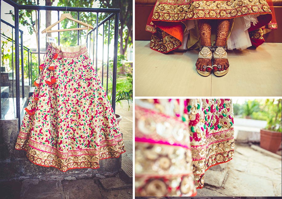 One thing was clear between us from the start – that I would be designing all the outfits for all the functions at our wedding. I had a faint idea about my wedding lehenga and the way I wanted to design it! I definitely wanted threadwork to feature in it, with very minimal bling and a dash of orange. Anurag has a very subtle choice when it comes to clothes, so his sherwani needed to have very intricate detailing. I am a person who loves playing with bright colors and wanted different looks for all my functions. I designed outfits for my parents and brother too.