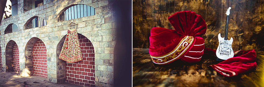 Anurag wore a sharp sherwani with a fully embroidered front and a red waist band, which matched his red safa (turban) perfectly. The couple made a compelling picture together with their beautifully matched ensembles – especially when they stood side by side in a glass circle as fireworks lit up the skies around them.