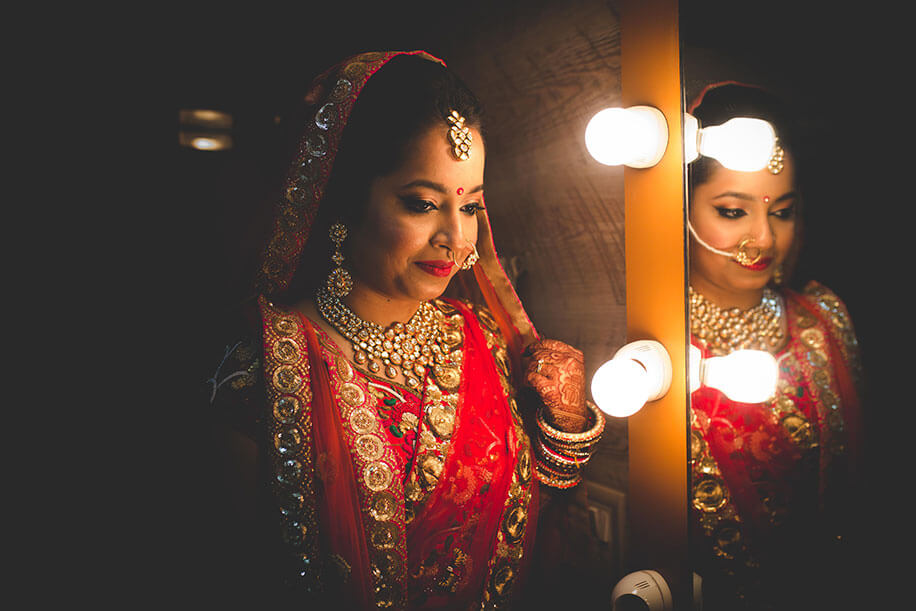 As a designer I’ve always dreamt of designing my own wedding lehenga! But when I got my chance, I didn’t know where to start. I love beautiful thread work with bright colors. Soon I started getting samples made with few ideas in my mind. My mom, who is my biggest support, always knew what I exactly wanted and helped me put together the perfect look! As my sangeet look involved peacocks with jharokas (windows) in zardosi work, I opted for jaal (net) design in thread work. I was very happy when my dream wedding lehenga turned out exactly how I wanted it to.