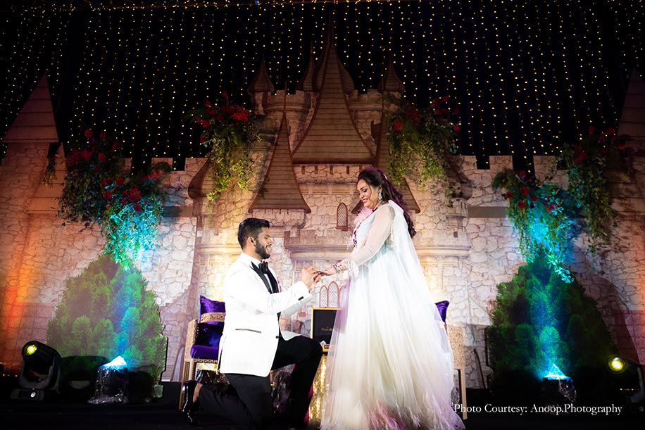 Naseha and Mashrur’s engagement ceremony took place at the oceanfront lawn of the resort. With a fairytale theme, the ceremony had whimsical decor comprising a gigantic castle erected on the stage along with massive parachutes, arches and other floral embellishments. The magnificent ocean gave the occasion a perfect emerald backdrop.