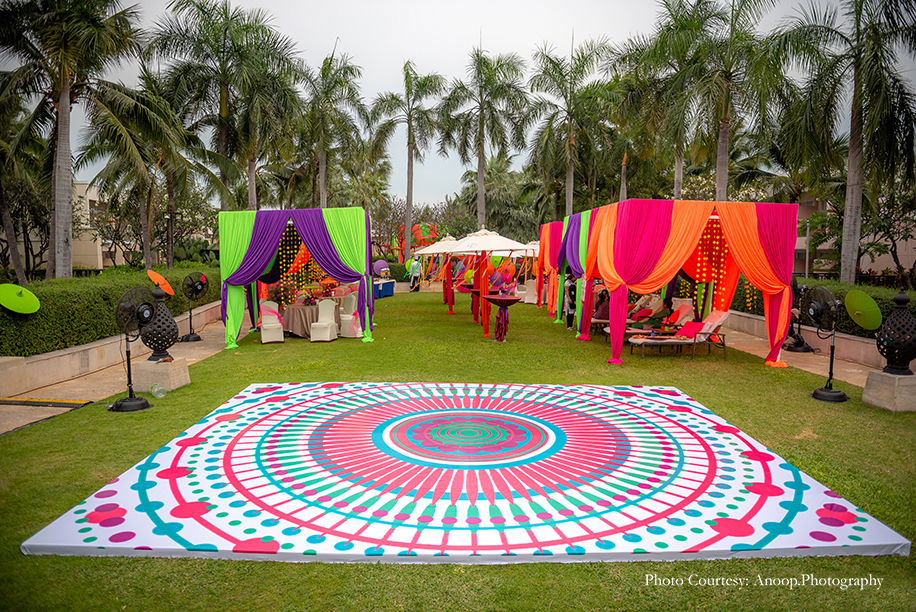 The sangeet was held at the glamorous ballroom of the resort, and the theme for the evening had traditional Arabic elements. With intricate motifs, creatively placed lighting and musical instruments like traditional drums, I Do Etc. turned the sangeet into a rich sensorial experience for the guests.