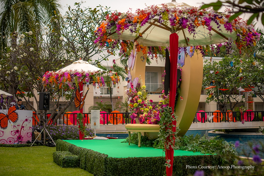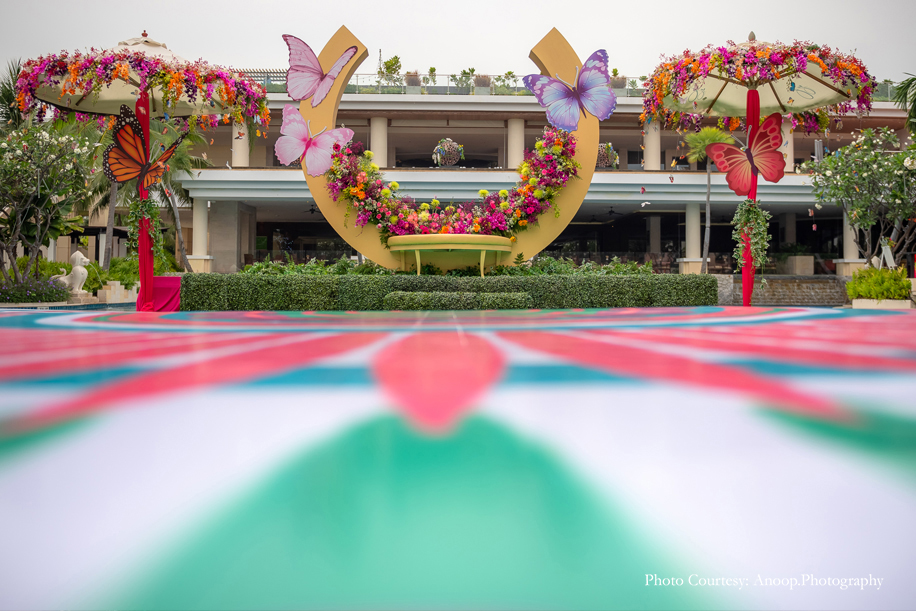 Naseha and Mashrur’s ‘Holud’ or the haldi ceremony was a boisterous affair dominated by vibrant colours and a fun vibe. Colourful canopies with day loungers were set up for guests to relax in, while the rest of the decor included vibrant umbrellas, flowers and massive butterfly cut-outs.