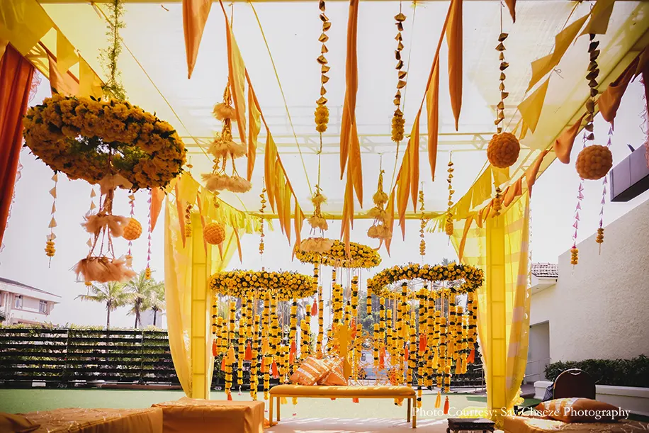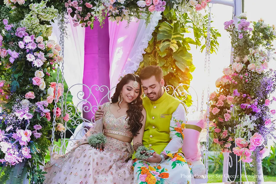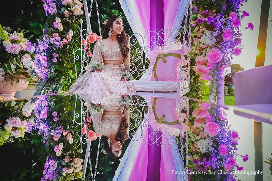 Inspired by the elegance and the delicate pastel color palette of British tea parties, the outdoor sundowner Mehendi saw a profusion of pretty spring blooms, vintage white furniture, a swing and props. Blooms in hues of pink and lavender looked enchanting against the lush surroundings, and perfectly transitioned the event from day to night. The groom looked radiant in a floral kurta set with a sunny yellow Bandi, while the bride looked dainty in an embellished blush lehenga and hair in soft, open curls.