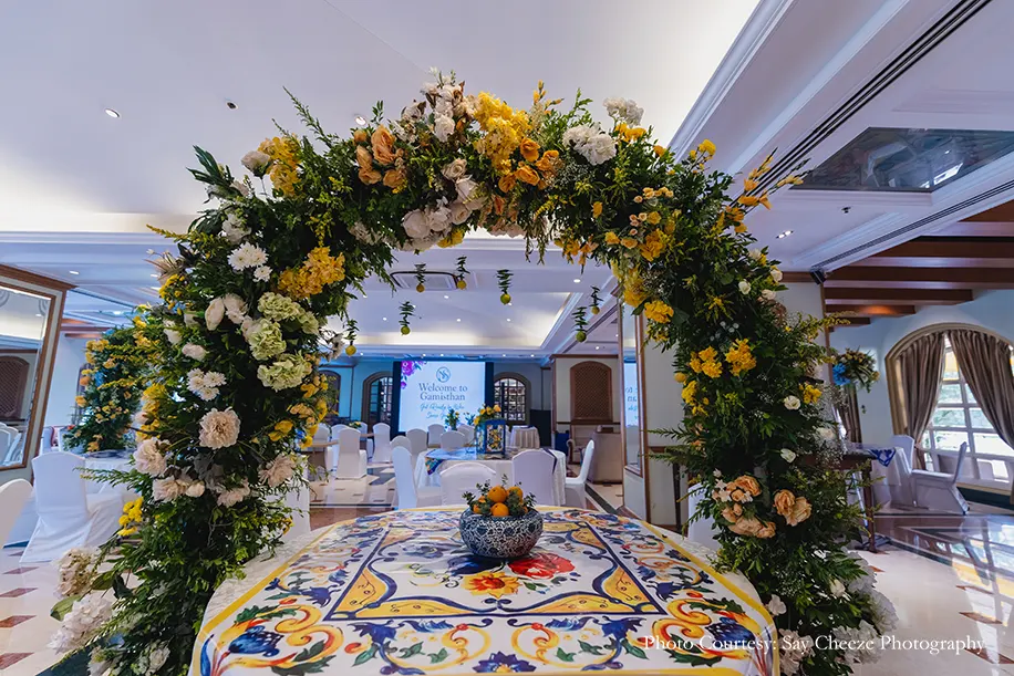 The next day began with a casual brunch that saw fun games and merriment accompanied by delicious foods and mimosas. The event saw bright décor of yellow and blue inspired by the Amalfi coast of Italy, and included traditional motifs and an abundance of citrus fruits.