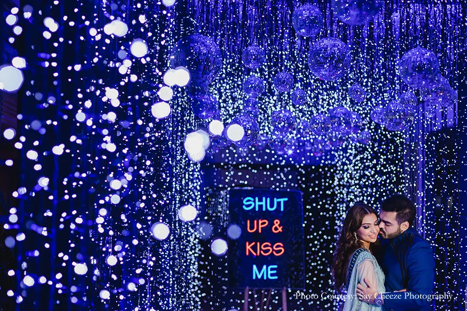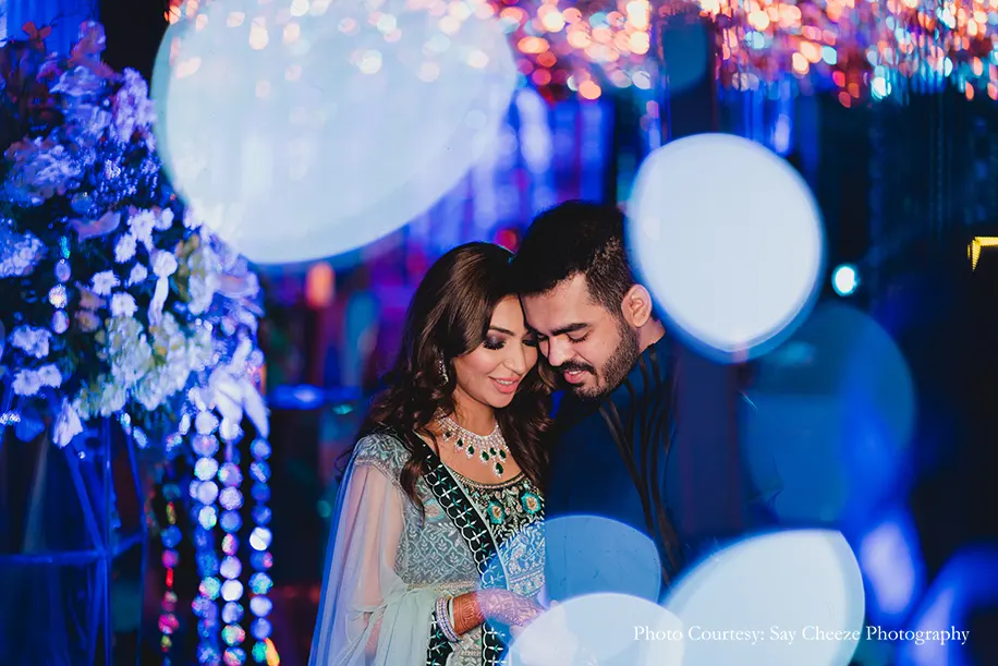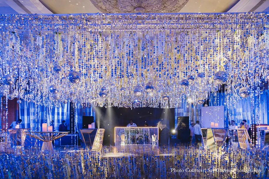 The Sagan and Engagement welcomed the guests into a magical night of glitz and glam. Bathed in an ethereal blue light, the décor of shimmering lights, mirrors and disco balls set a transcendent ambience as the couple and their loved ones danced the night away in great fervor. Their rich ensembles in enigmatic hues of blues and greens perfectly complemented the festivities.