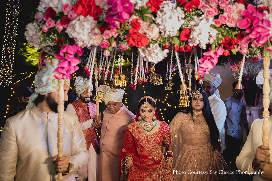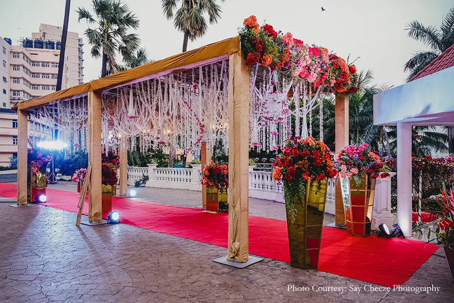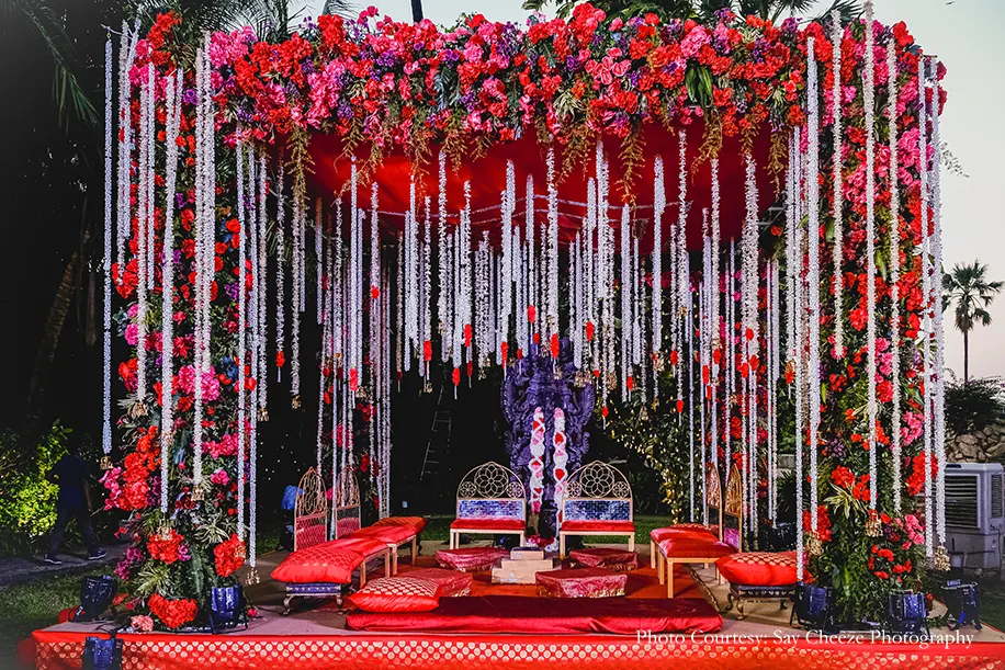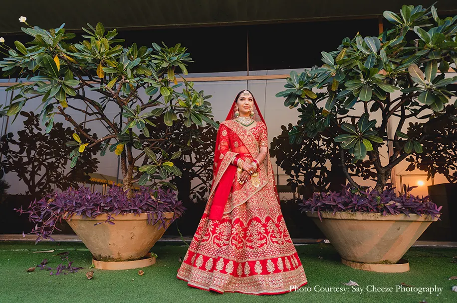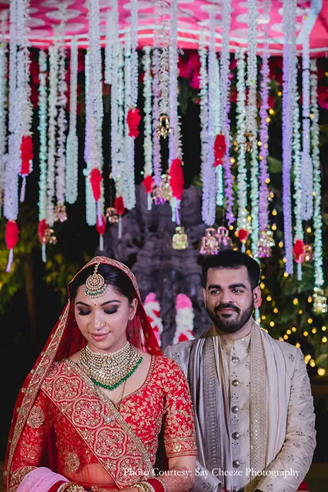The wedding ceremony was a royal affair in red, with a confluence of blooms in decadent hues of red and dark pinks adorning the lush lawns of the hotel. An enchanting canopy of white flower garlands framed the entrance, continuing on to the mandap, while dashes of gold lent even more opulence to the evening. The Sabyasachi couple dazzled in complementing attires of red and gold, and looked like the portrait of happiness as they tied the knot.